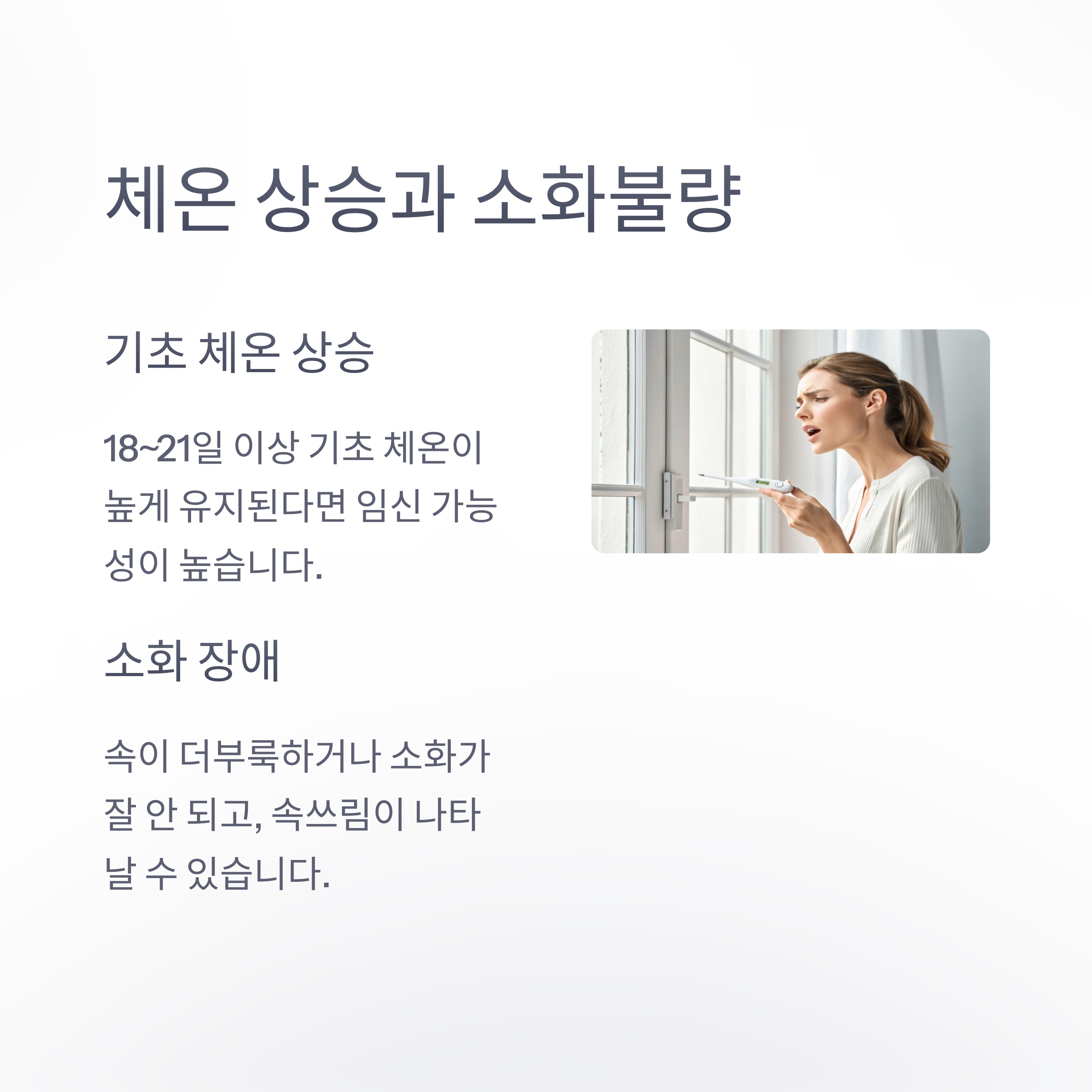 | 신체 변화를 예민하게 관찰하는 것 중요 | 기초 체온 지속 상승도 확인 포인트 | 가벼운 식사와 충분한 휴식 필요 |