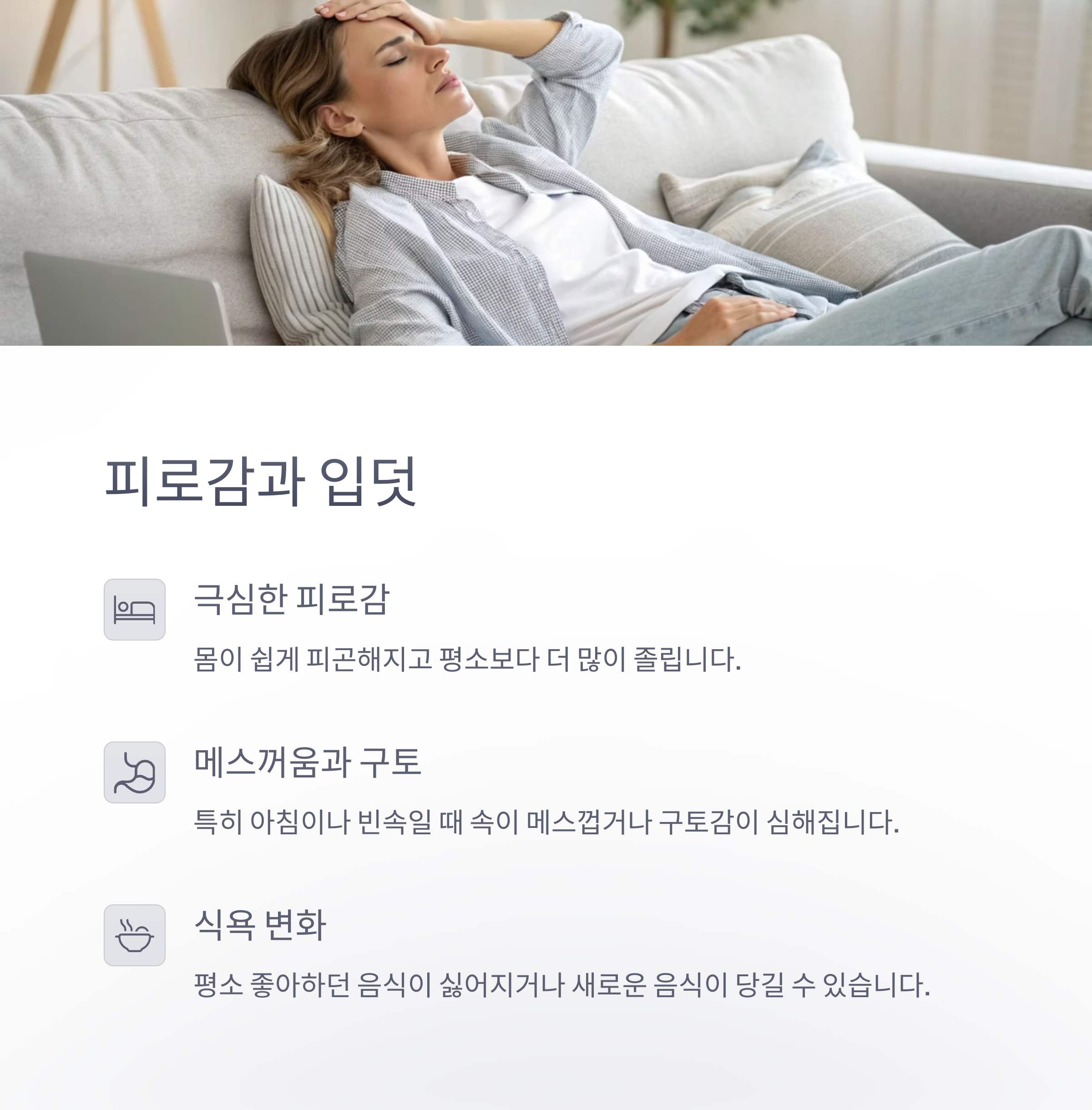 | 임신 초기 대표 증상 | 생리 중단, 입덧, 가슴 통증, 피로 등이 대표적입니다. |