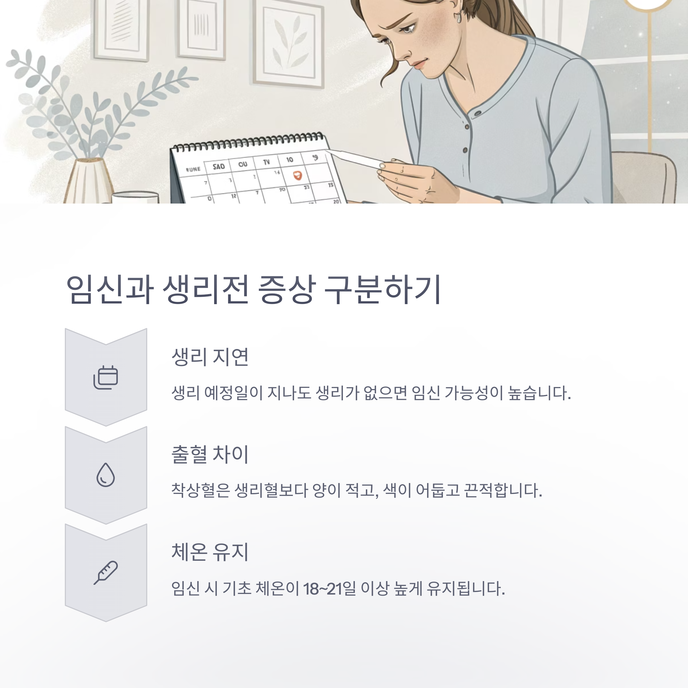 | 신체 변화를 예민하게 관찰하는 것 중요 | 기초 체온 지속 상승도 확인 포인트 | 가벼운 식사와 충분한 휴식 필요 |