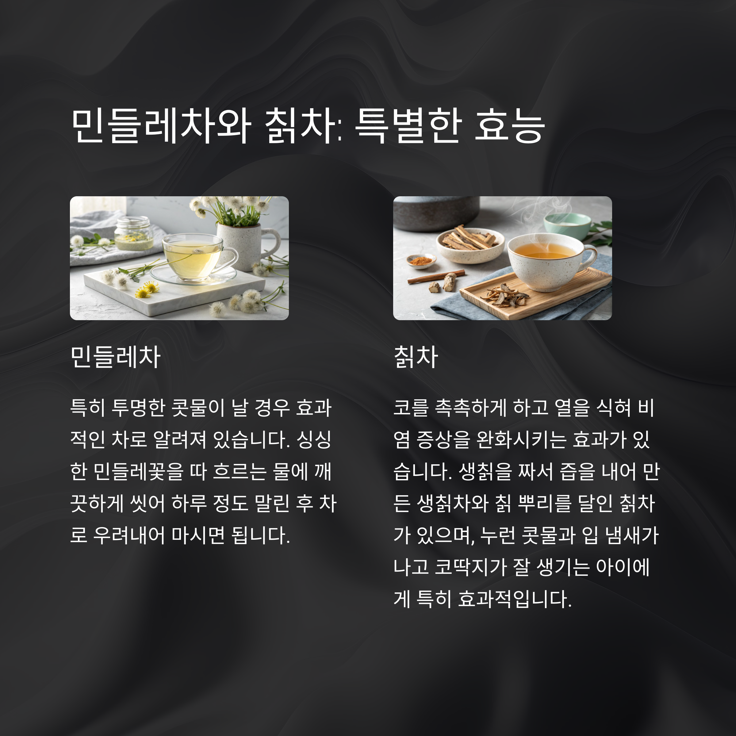 개인의 증상에 따라 적절한 차를 선택하여 마시면, 불편한 콧물 증상을 자연스럽게 완화하는 데 큰 도움이 됩니다.