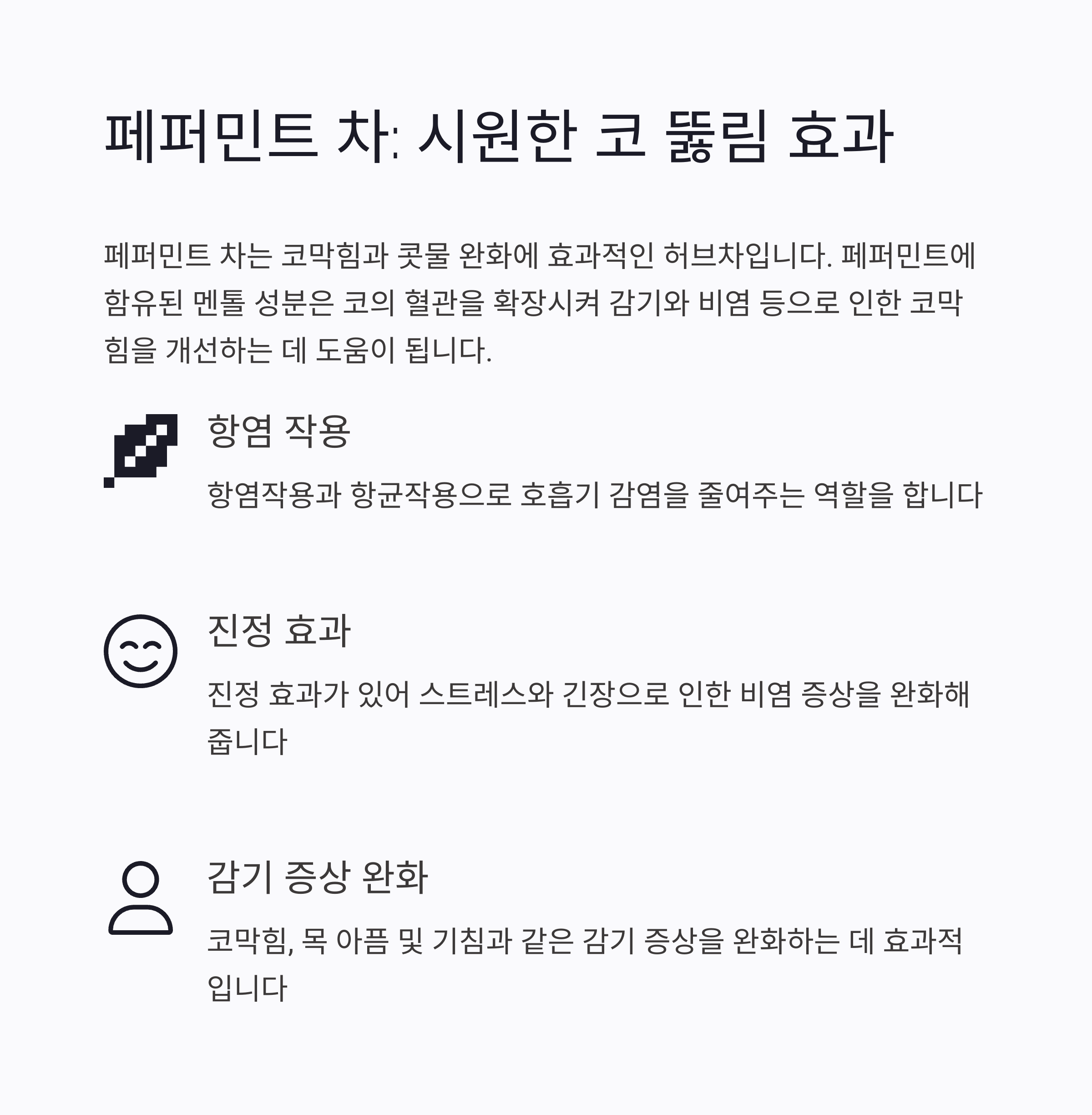 페퍼민트 차는 코막힘과 콧물 완화에 효과적입니다. 페퍼민트에 포함된 멘톨 성분은 코 점막을 진정시키고, 혈관을 확장시켜 원활한 호흡을 돕습니다. 감기로 인한 코막힘이나 알레르기 비염이 있을 때 따뜻한 페퍼민트 차 한 잔은 증상을 빠르게 완화해줄 수 있습니다. 동시에 스트레스로 인한 비염 악화에도 긍정적인 영향을 미칩니다.
