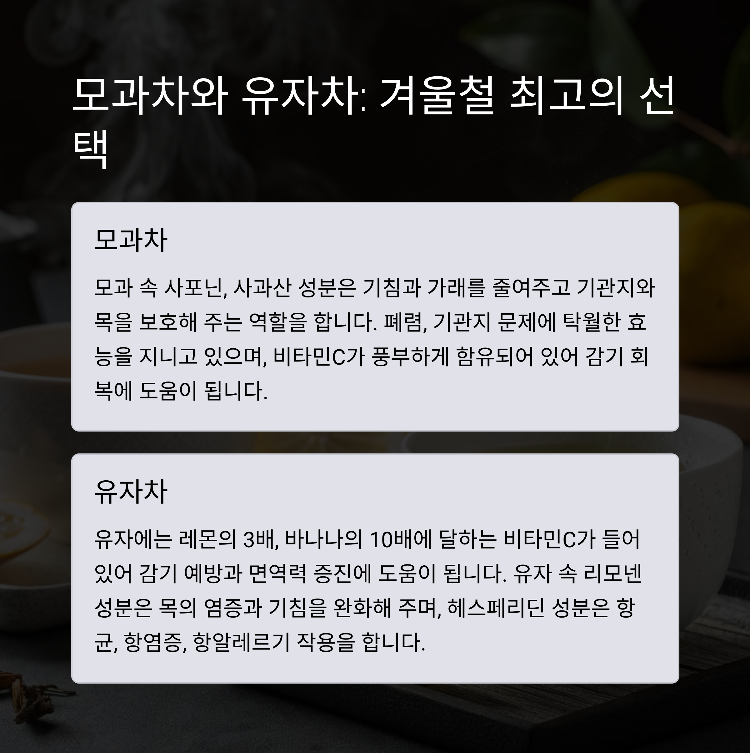 모과차는 따뜻한 성질을 지녀 폐 건강에 탁월합니다. 사포닌, 사과산이 풍부해 기관지와 목을 보호하고, 가래를 삭여주는 역할을 합니다. 콧물 외에도 목감기 증상이 동반될 때 모과차를 마시면 효과적입니다. 비타민C 함유량이 높아 감기 회복에도 도움이 됩니다.