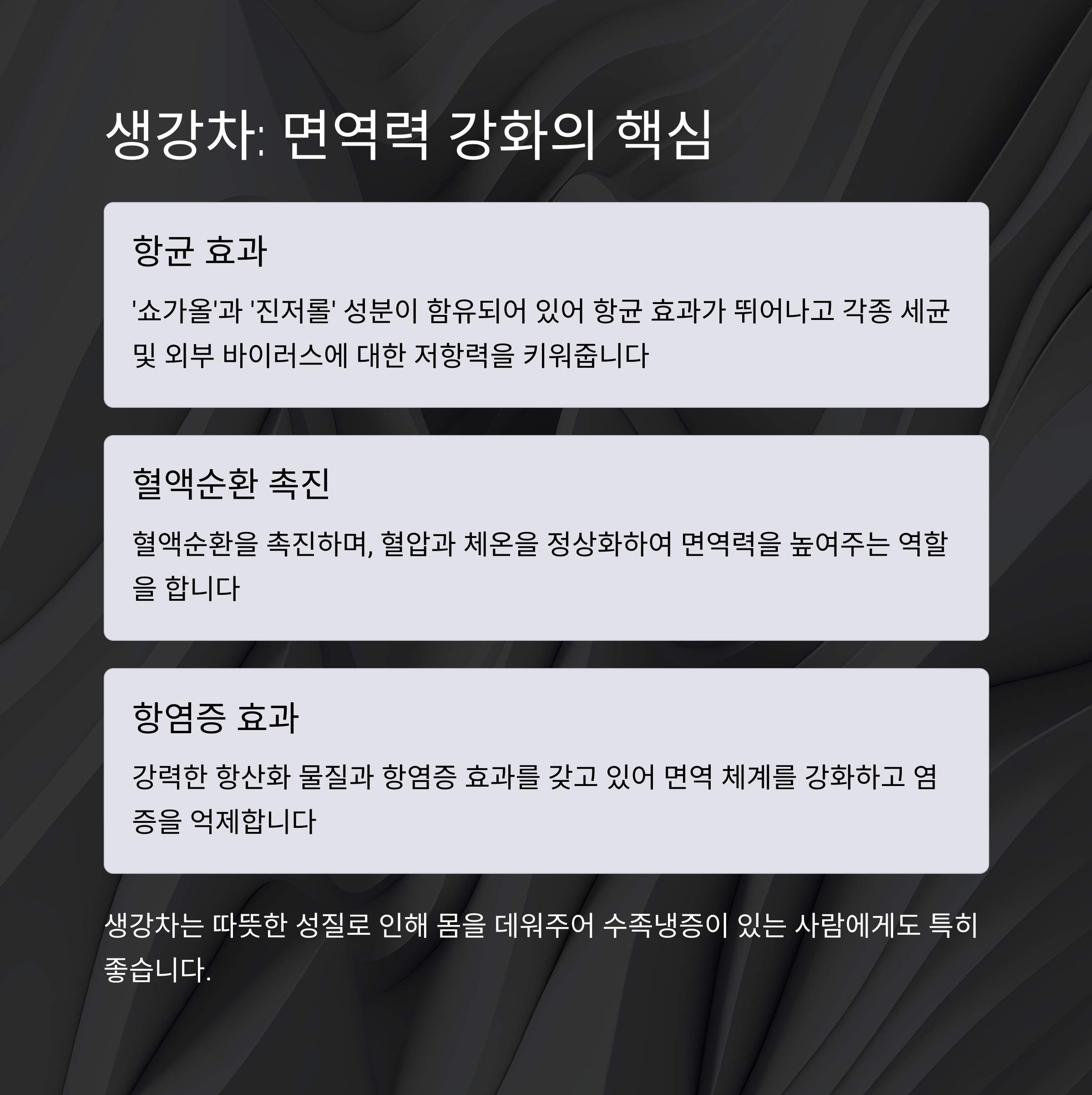 생강차는 콧물에 좋은 차로 대표적입니다. 생강 속 쇼가올, 진저롤 성분은 항균 작용을 하여 외부 바이러스에 대한 저항력을 키워주며, 혈액순환을 촉진해 체온 유지에 도움을 줍니다. 생강차를 따뜻하게 마시면 몸을 덥히면서 콧물 완화에 효과를 볼 수 있습니다. 또한 생강은 항염작용도 뛰어나 코 점막 염증을 줄이는 데 기여합니다.