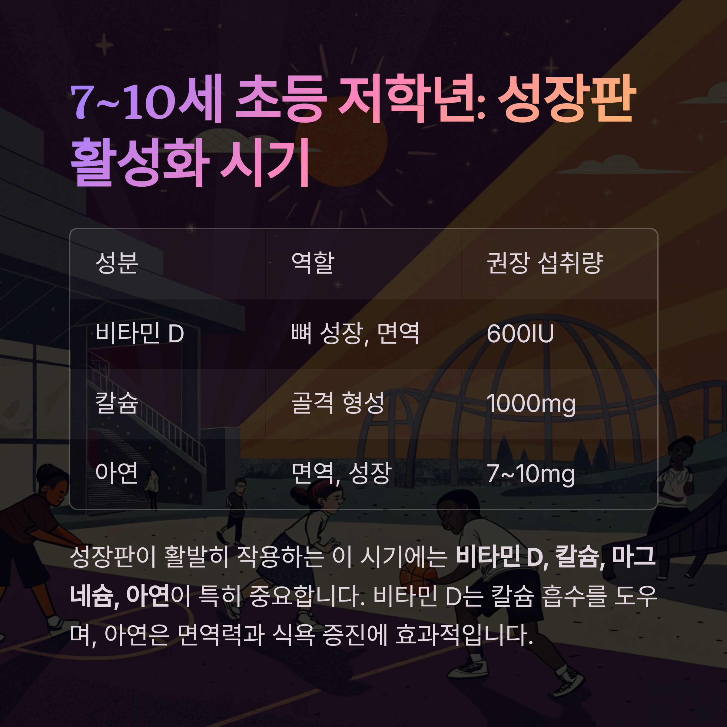 성장판이 활발히 작용하는 이 시기에는 비타민 D, 칼슘, 마그네슘, 아연이 특히 중요합니다.