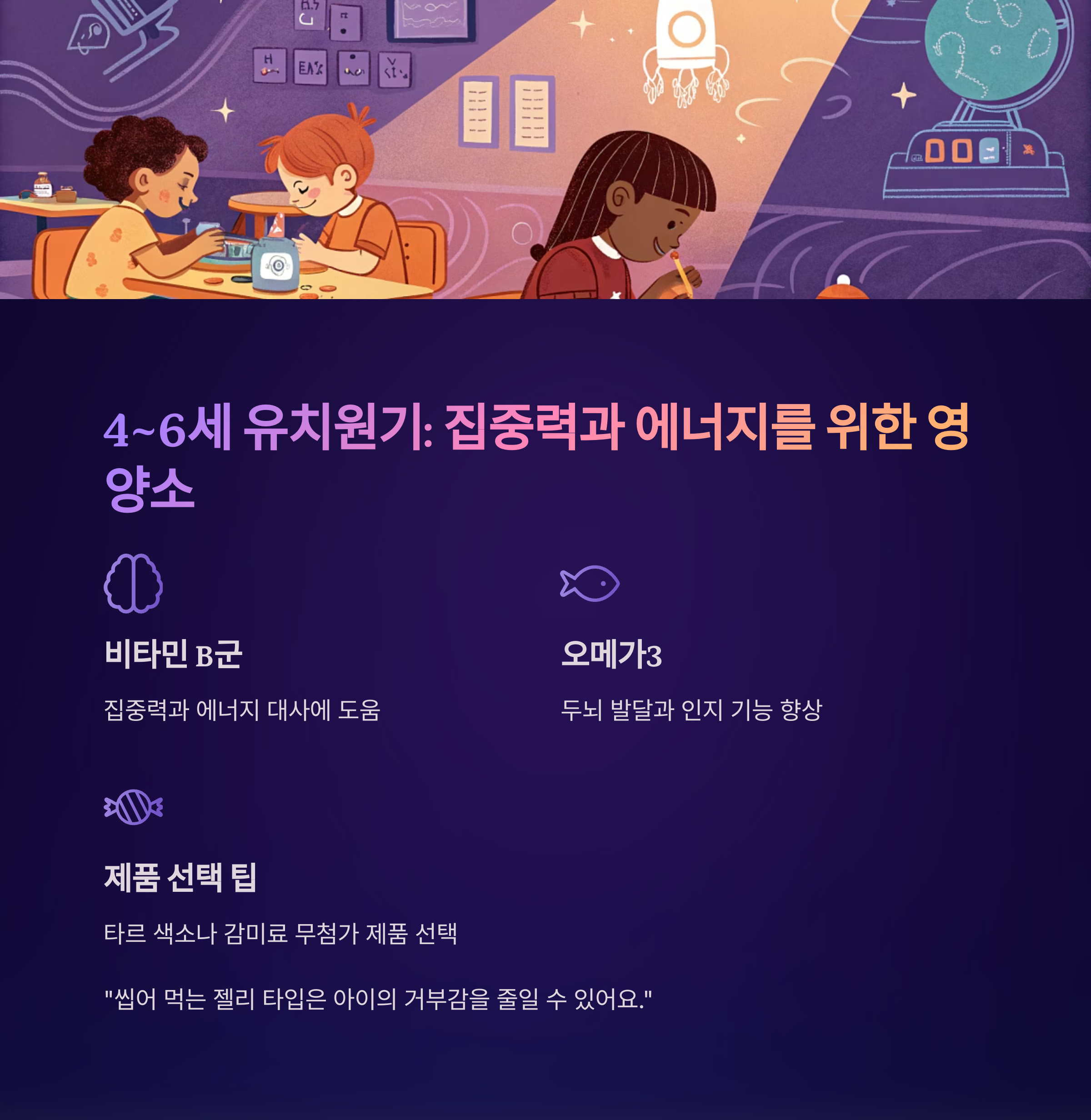 이 시기의 아이들은 활동량이 많아지며, 비타민 B군과 오메가3가 집중력과 에너지 대사에 도움을 줍니다.