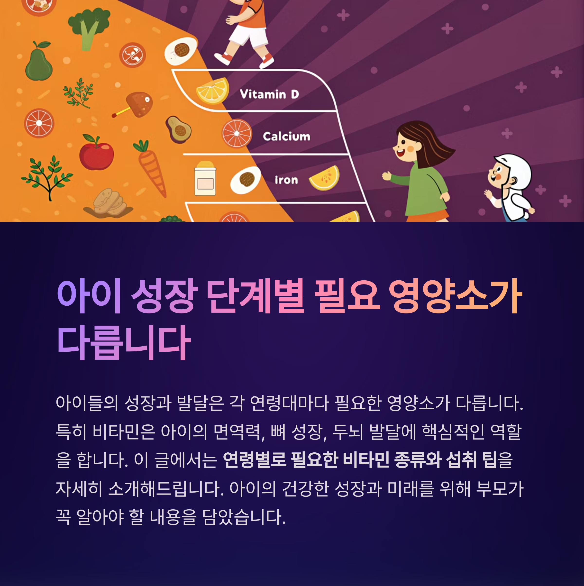 특히 비타민은 아이의 면역력, 뼈 성장, 두뇌 발달에 핵심적인 역할을 합니다.