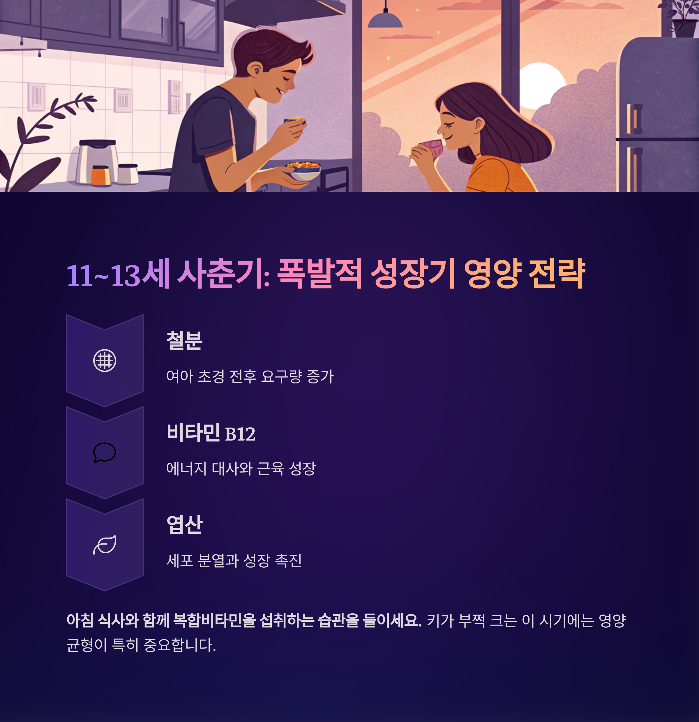 여아는 초경 전후 철분 요구량이 늘어나며, 남아도 근육 성장과 에너지 대사에 B군 비타민이 필요합니다.