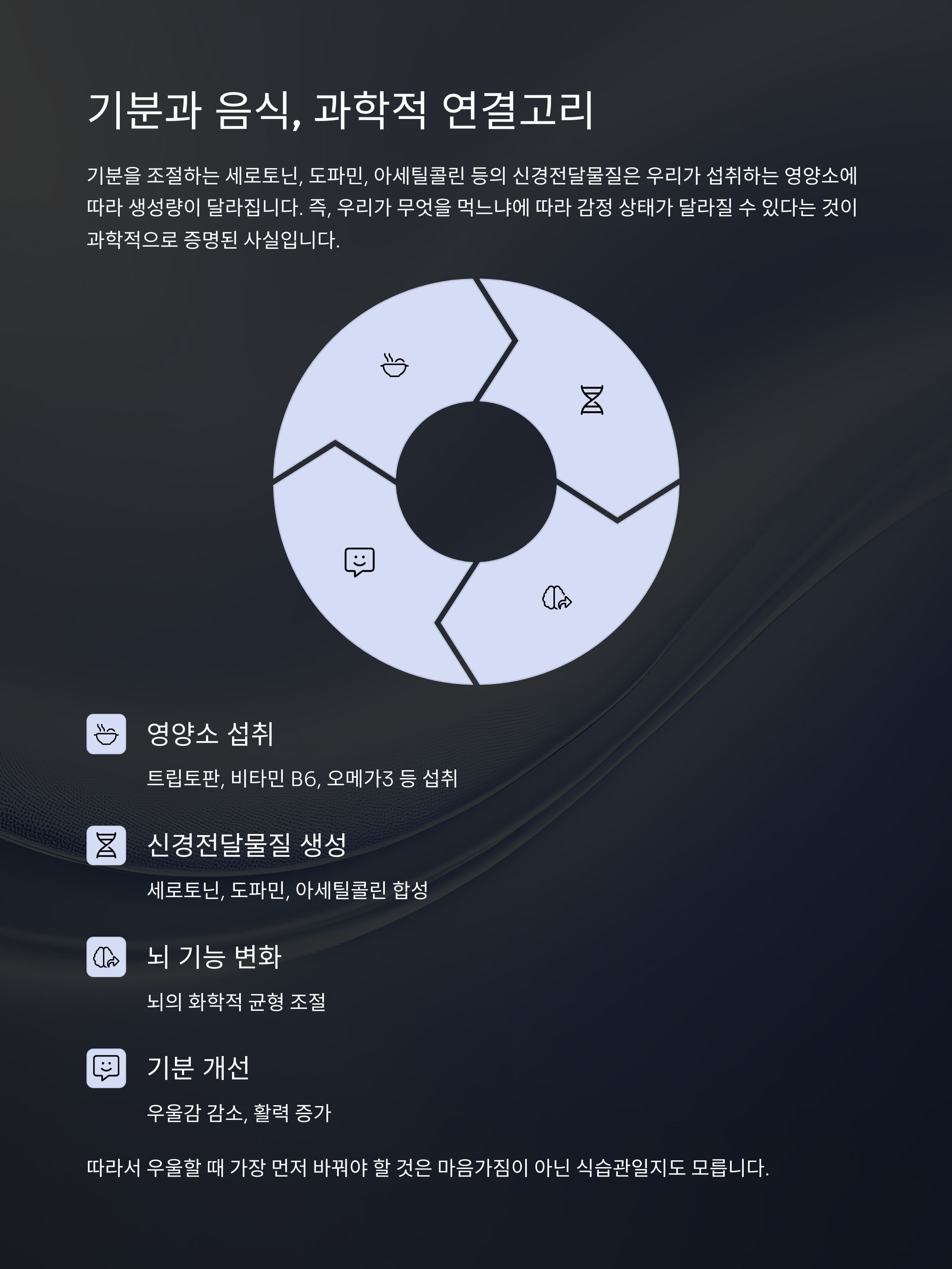 즉, 우리가 무엇을 먹느냐에 따라 감정 상태가 달라질 수 있다는 것이 과학적으로 증명된 사실입니다.