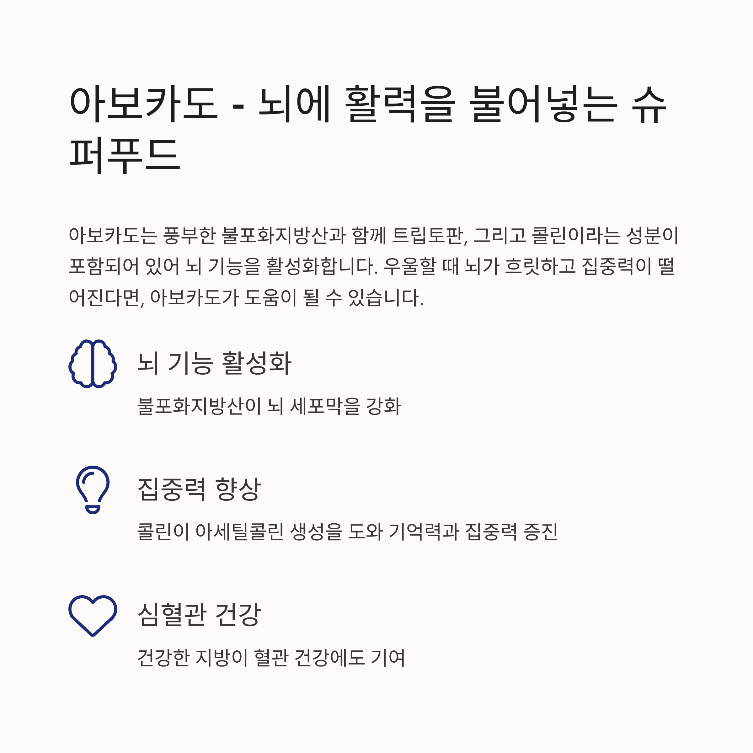 우울할 때 뇌가 흐릿하고 아무 생각이 나지 않는 느낌을 받는다면, 아보카도 반 개로 뇌에 ‘기름칠’을 해보세요.