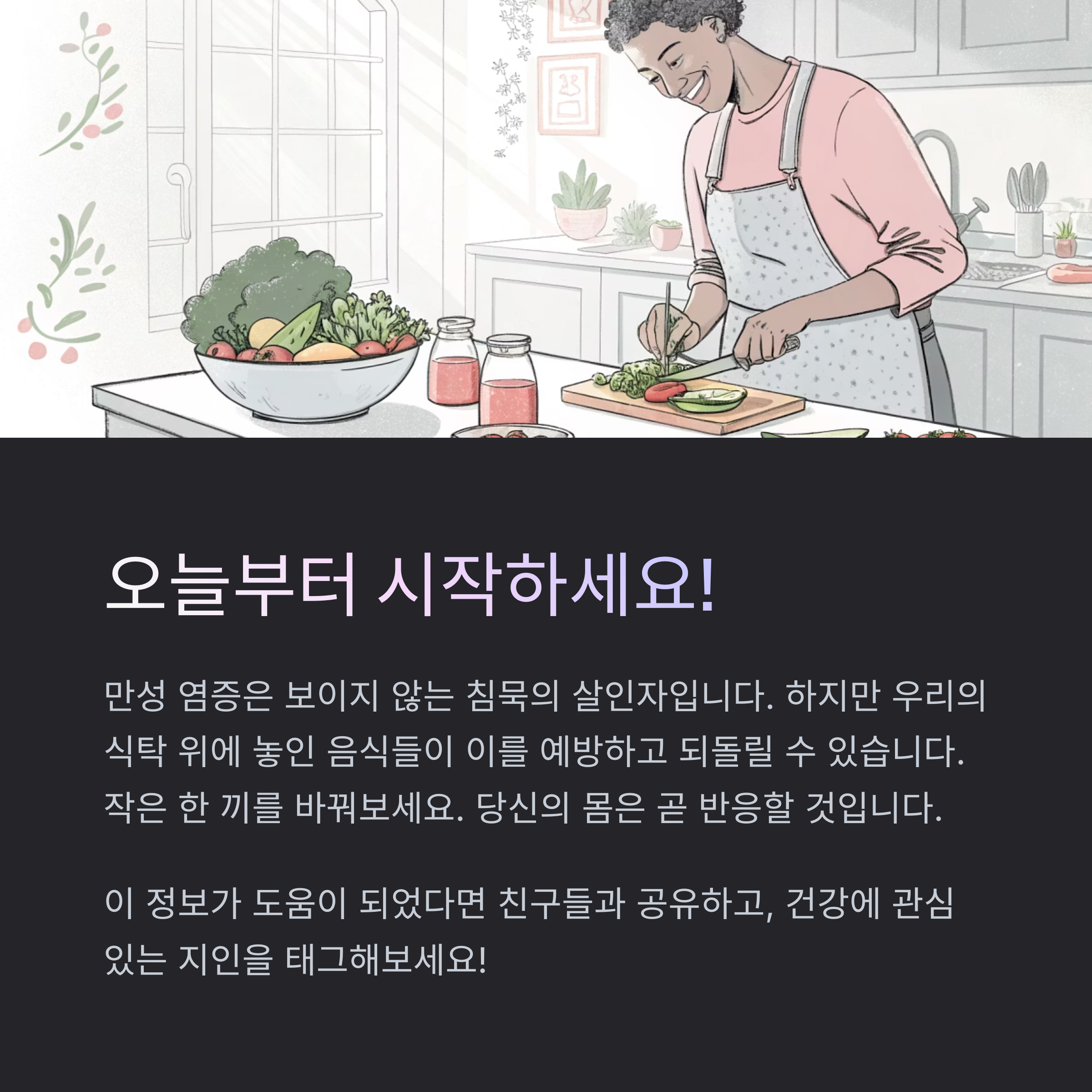 만성 염증은 보이지 않는 침묵의 살인자입니다. 하지만 우리의 식탁 위에 놓인 음식들이 이를 예방하고 되돌릴 수 있습니다. 항염증 식품을 꾸준히 섭취하고, 건강한 식습관을 유지하는 것이야말로 최고의 치료이자 예방책입니다. 오늘부터라도 작은 한 끼를 바꿔보세요. 당신의 몸은 곧 반응할 것입니다.