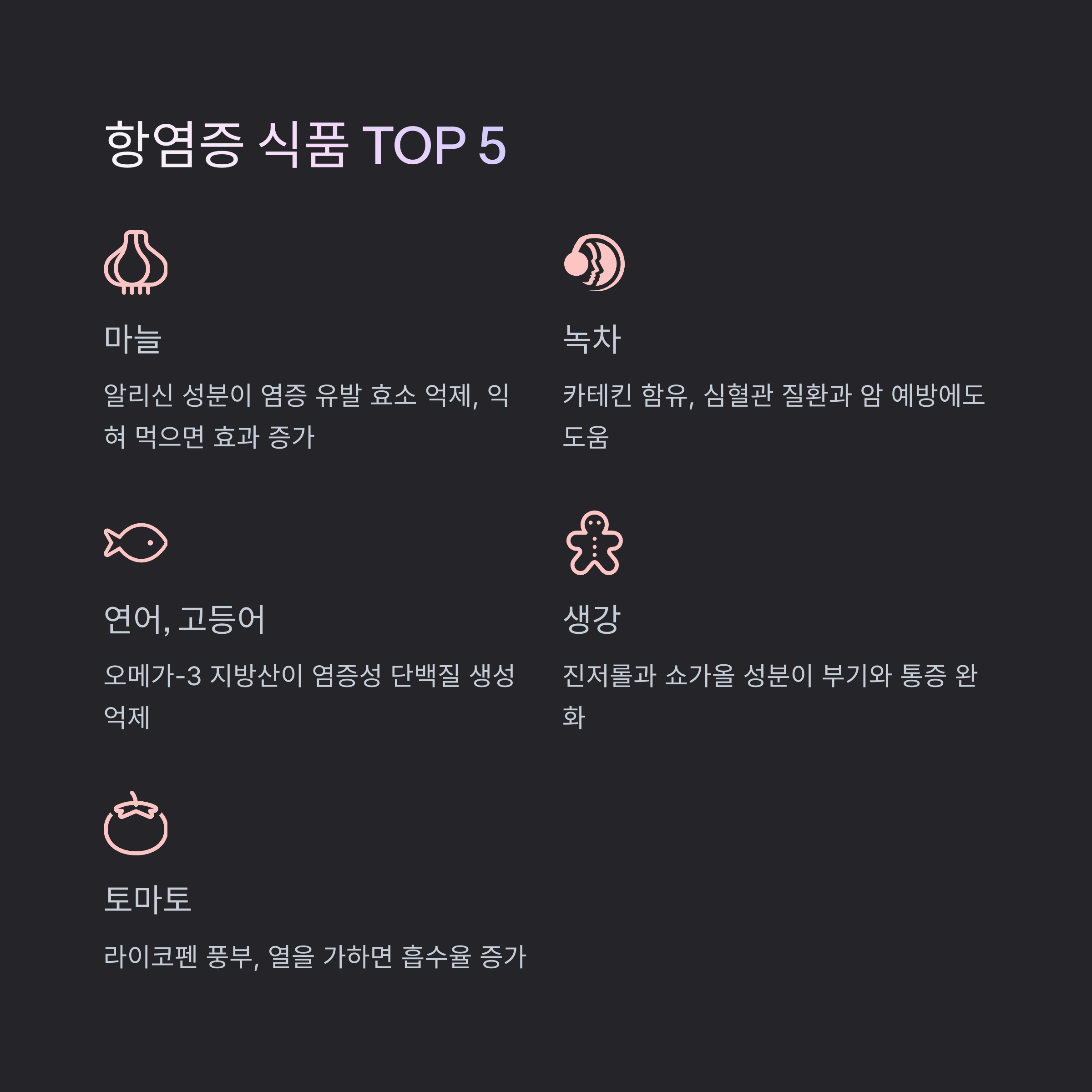 마늘은 천연 항염증제로 불립니다. 알리신이라는 활성 성분은 염증을 일으키는 효소 생성을 억제합니다. 익혀 먹을수록 효과가 더 강해진다고 알려져 있습니다.