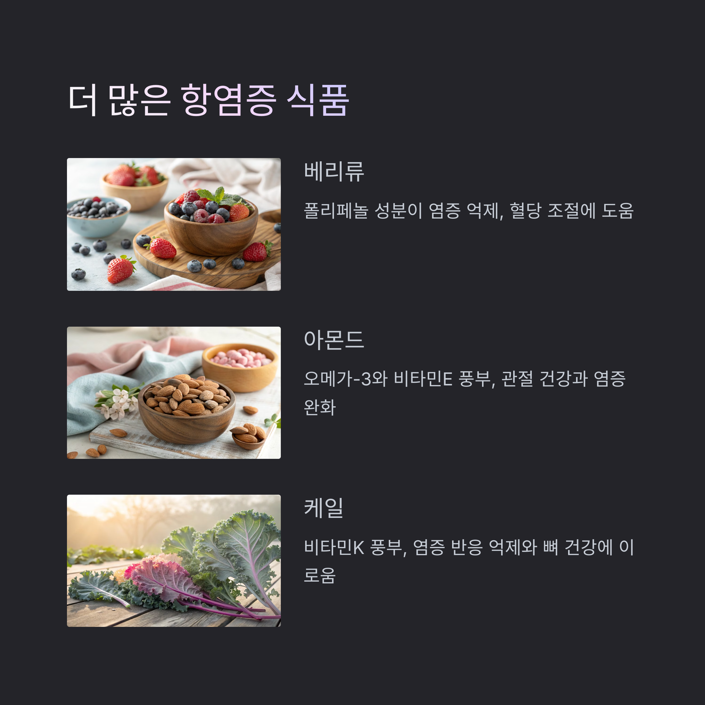 케일은 비타민K가 풍부하여 염증 반응을 억제하고 뼈 건강에도 이롭습니다. 녹즙이나 샐러드로 즐기기 좋습니다.