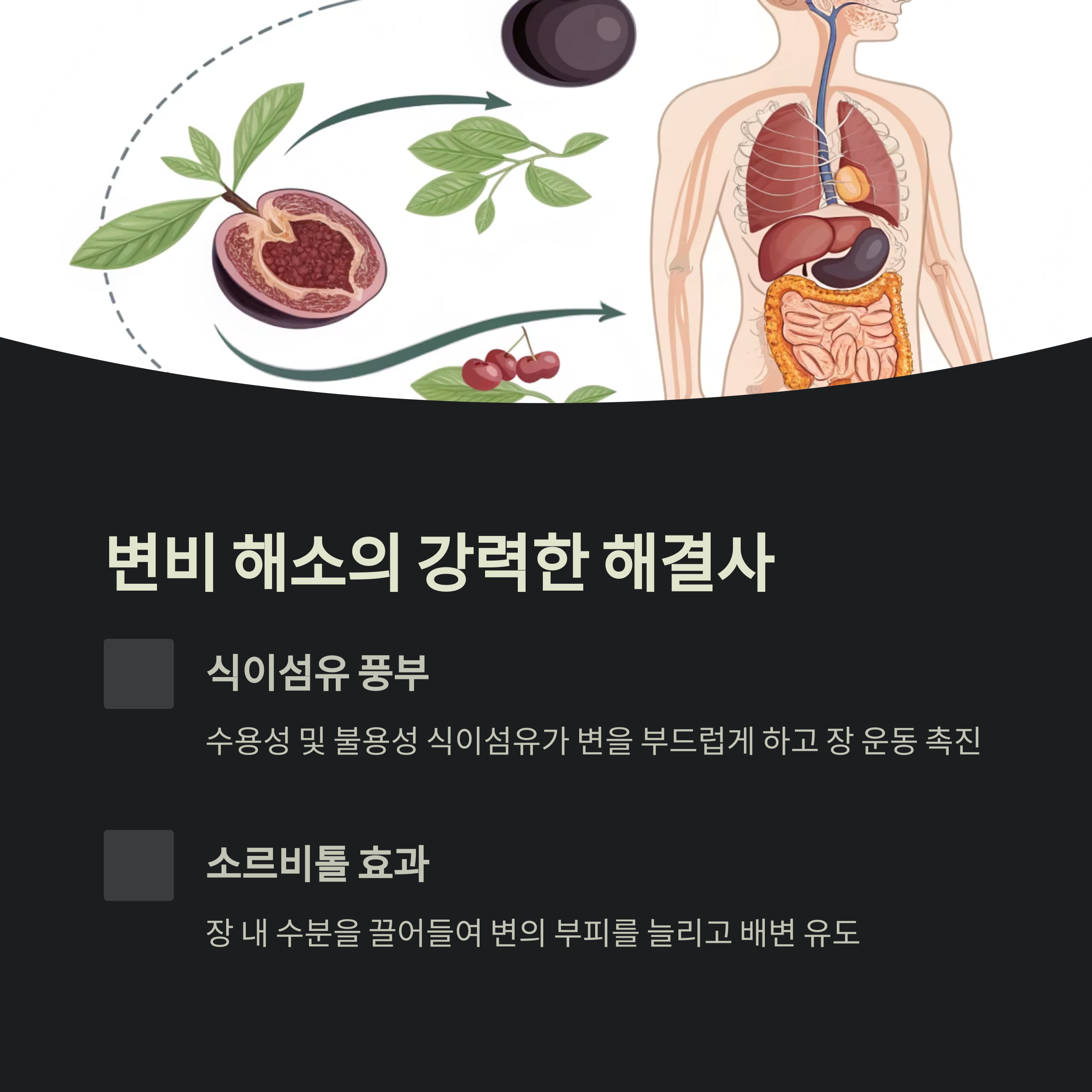 변비로 고생하는 분들에게 푸룬은 자연스럽고 부드러운 대안이 될 수 있습니다.