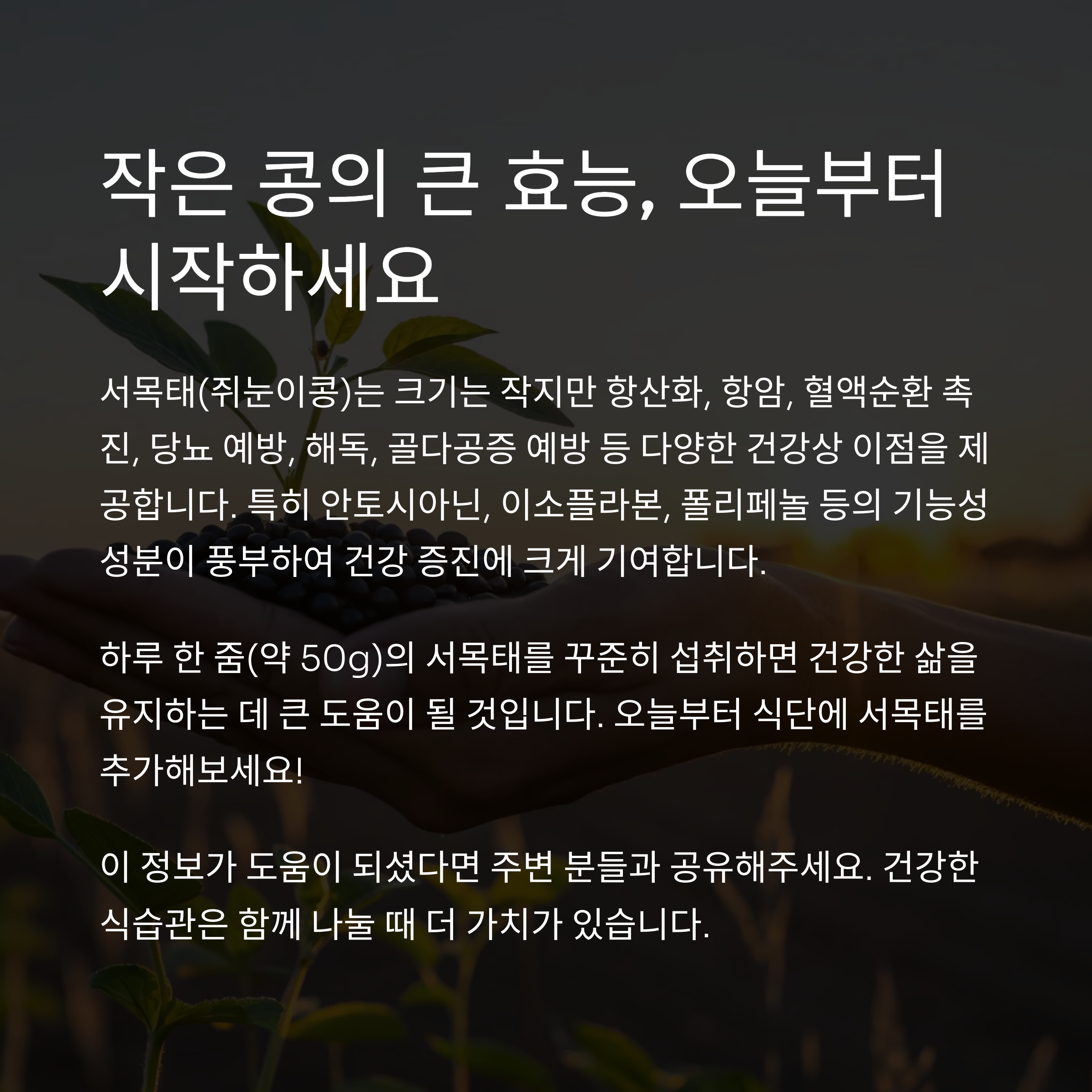중요: 서목태는 단일 식품으로 여러 장기의 건강을 한꺼번에 챙길 수 있는 드문 식품입니다.