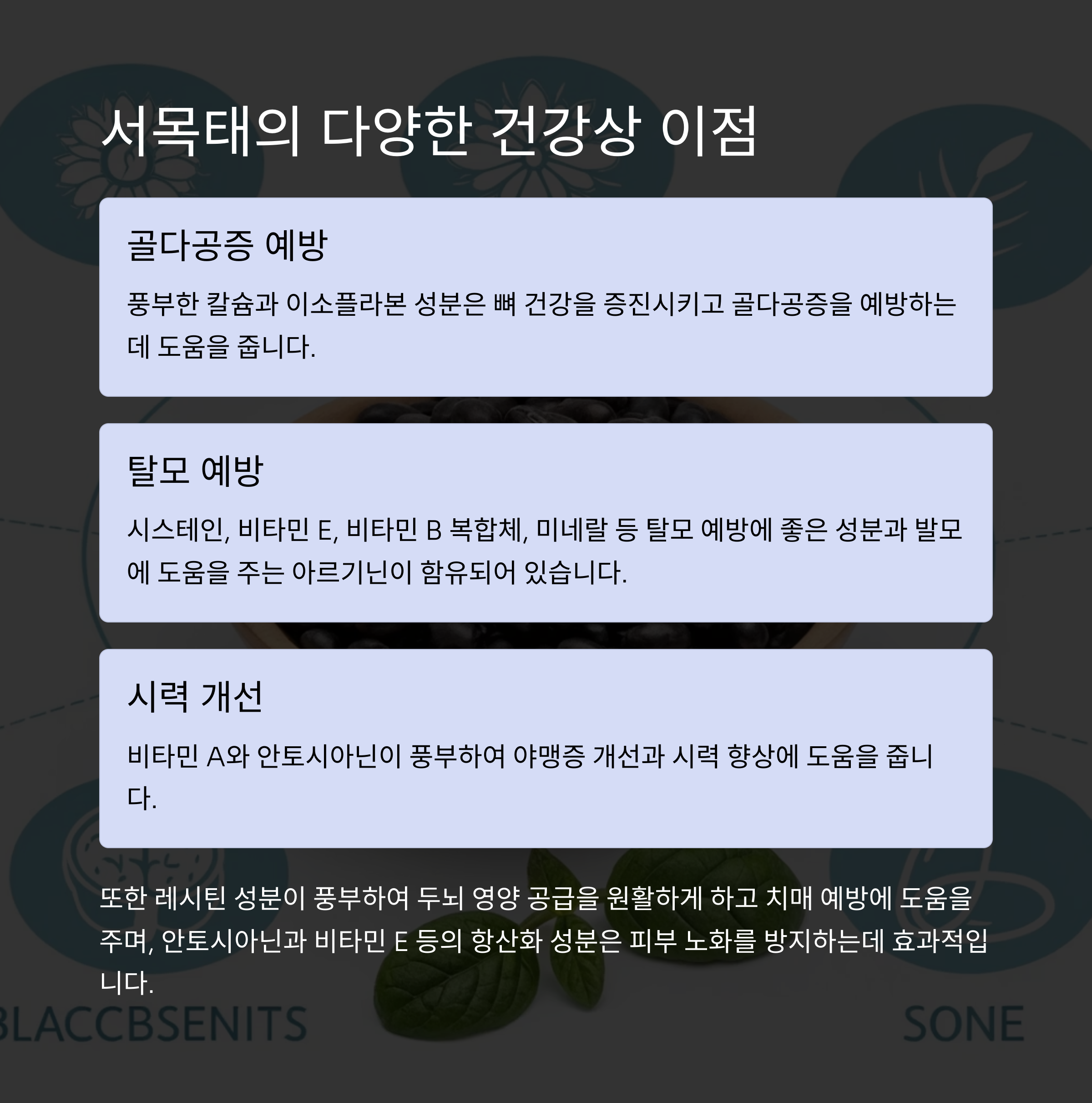 이로 인해 서목태는 단순한 영양 공급을 넘어 기능성 식품으로 주목받습니다.
