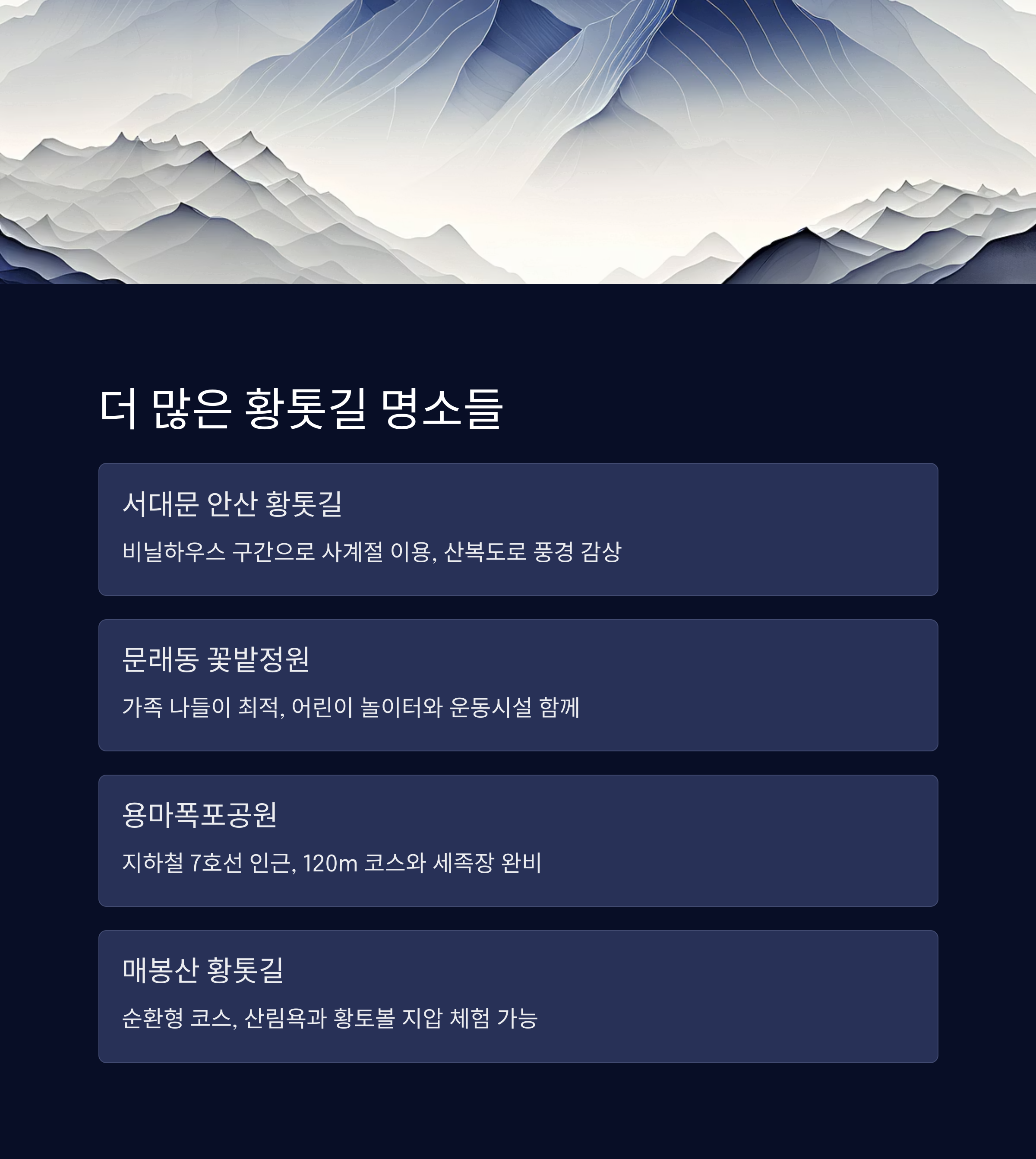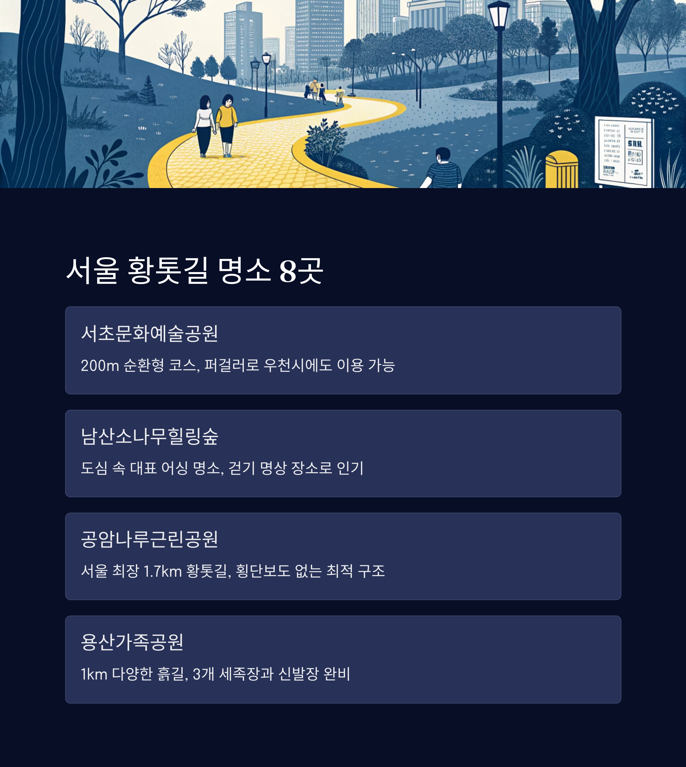 서울 곳곳에는 맨발 걷기에 적합한 황톳길이 속속 생겨나고 있습니다. 누구나 찾아가기 쉬운 접근성과 안전한 시설을 갖춘 곳들만 모았습니다.