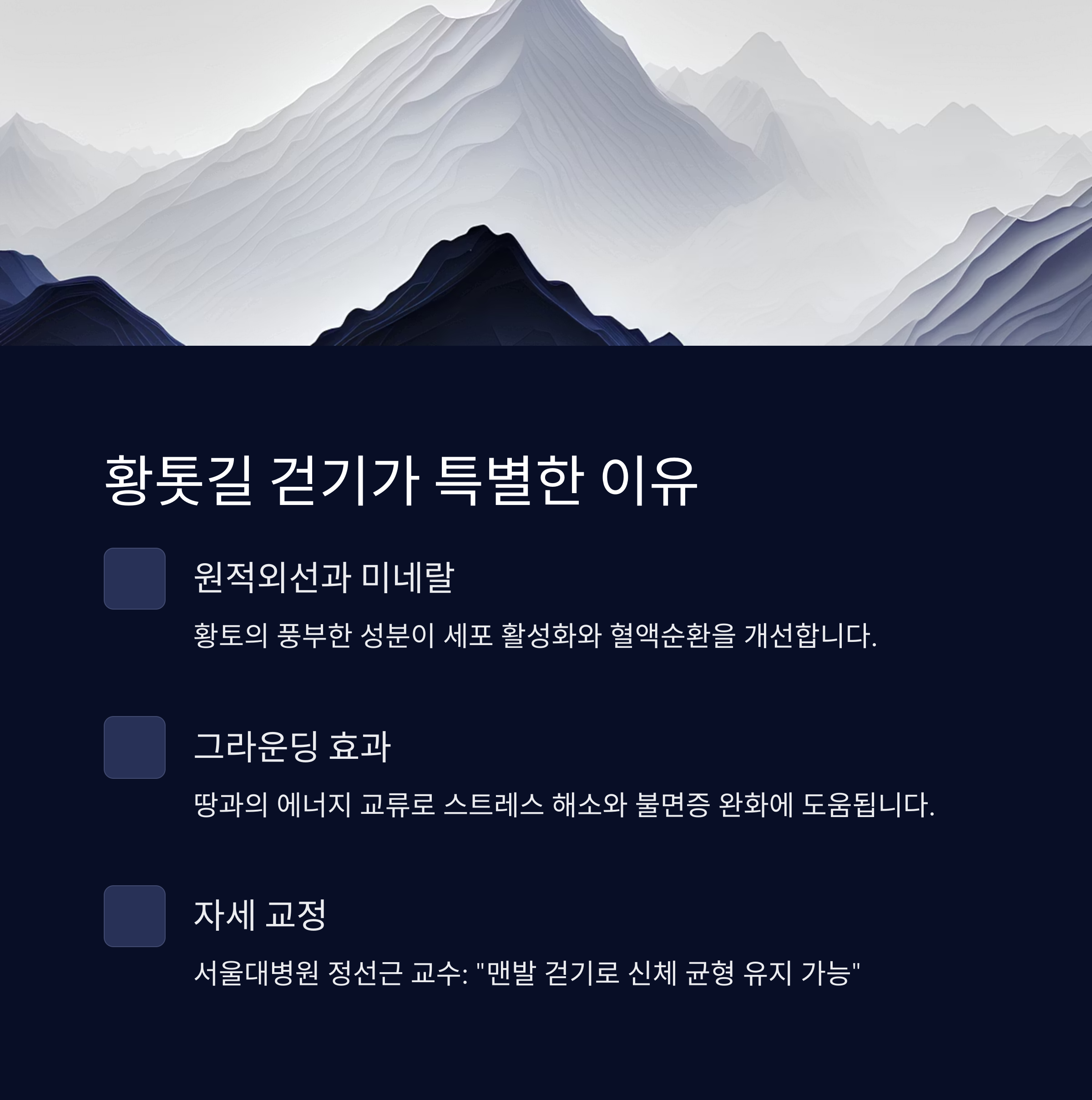 황톳길에는 원적외선, 미네랄, 항균 효소 등 인체에 이로운 성분이 풍부하게 포함되어 있어 세포 활성화, 혈액순환 개선, 불면증 완화, 스트레스 해소 등 다양한 건강 효과를 기대할 수 있습니다. 실제로 서울대학교병원의 정선근 교수는 “맨발 걷기만으로도 자세 교정 및 신체 균형 유지에 도움이 된다”고 말합니다.