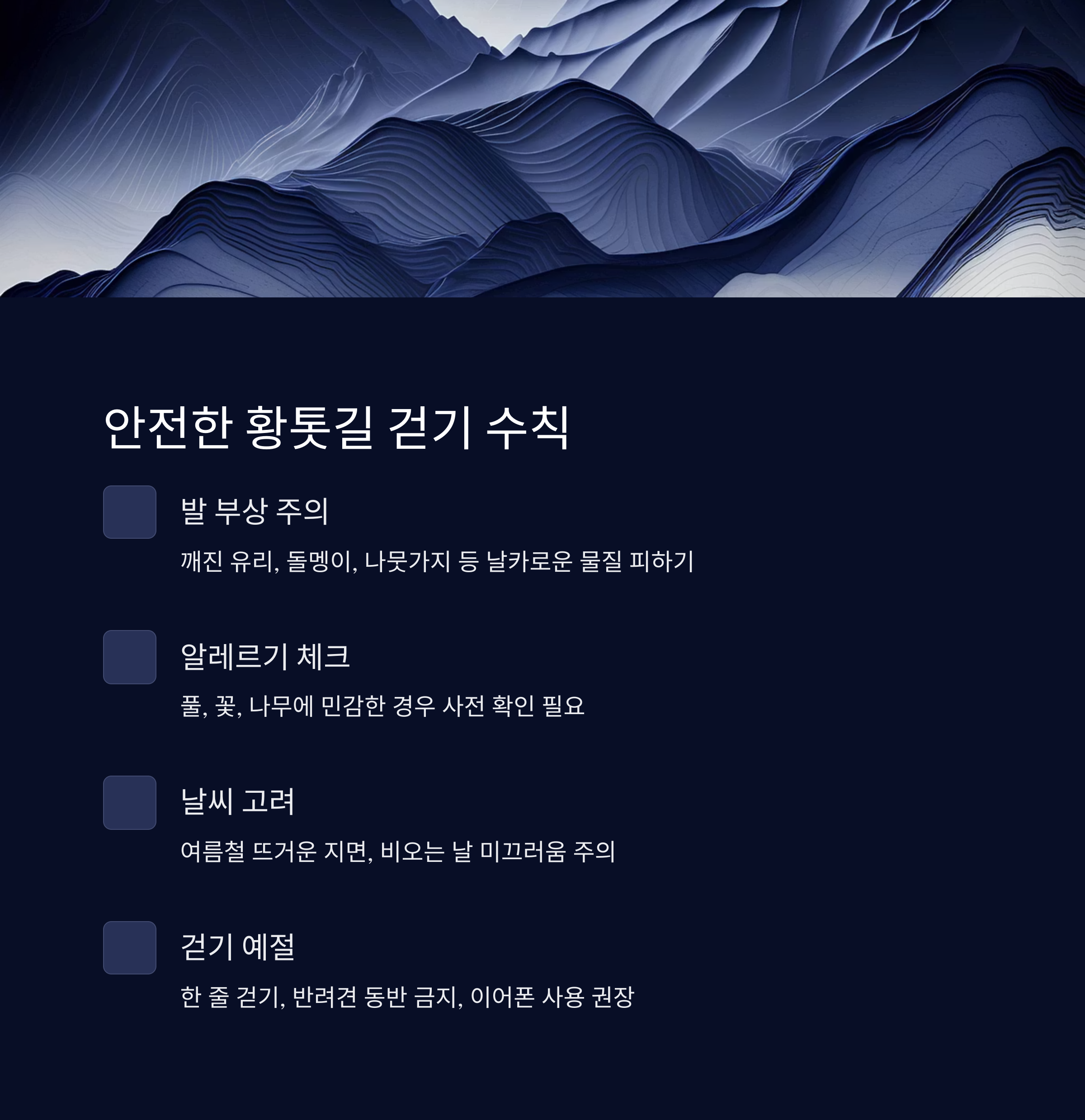 - 피부 자극 및 알레르기: 풀, 꽃, 나무 등에 민감한 사람은 걷기 전 알레르기 반응 체크가 필요합니다.