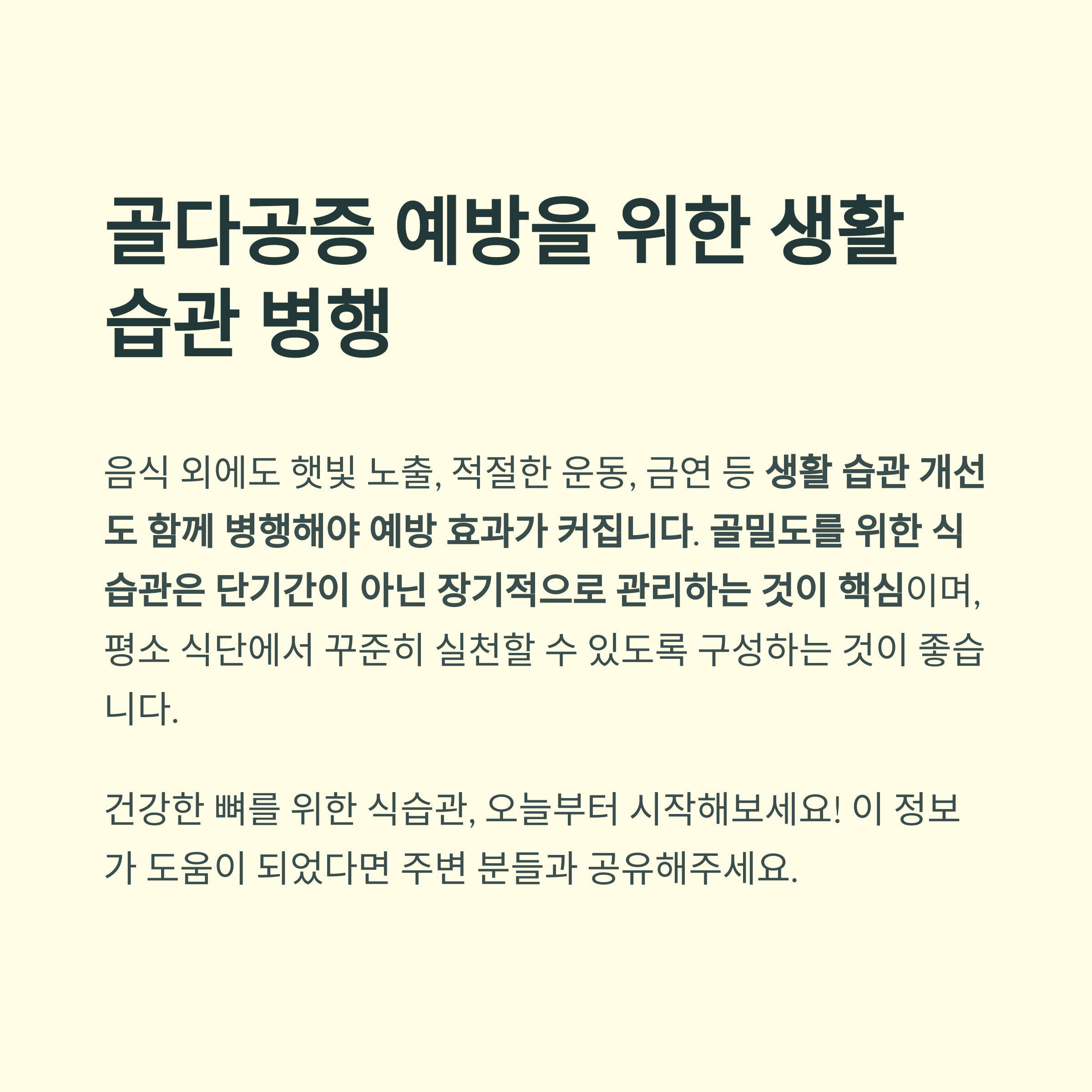 골밀도를 위한 식습관은 단기간이 아닌 장기적으로 관리하는 것이 핵심이며,