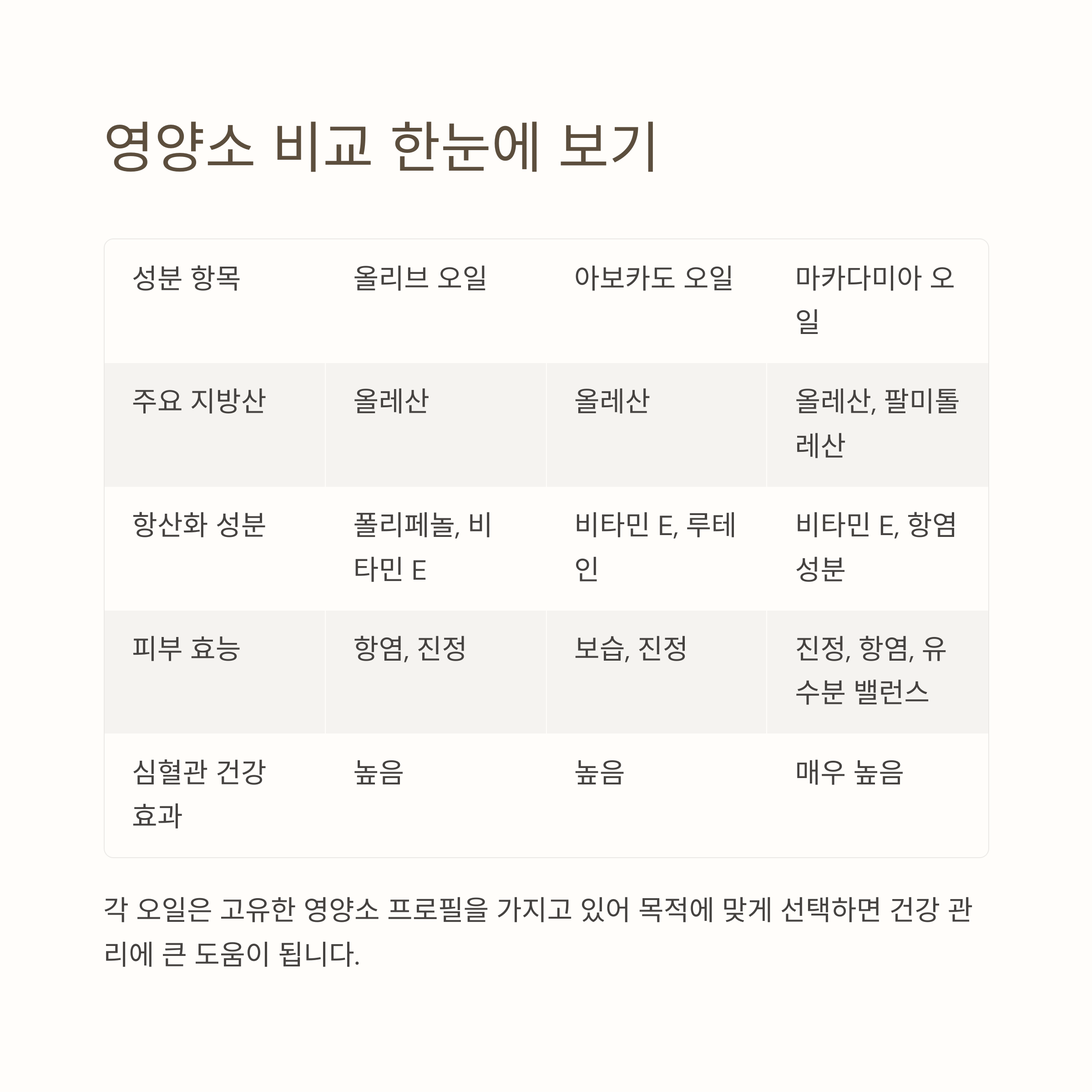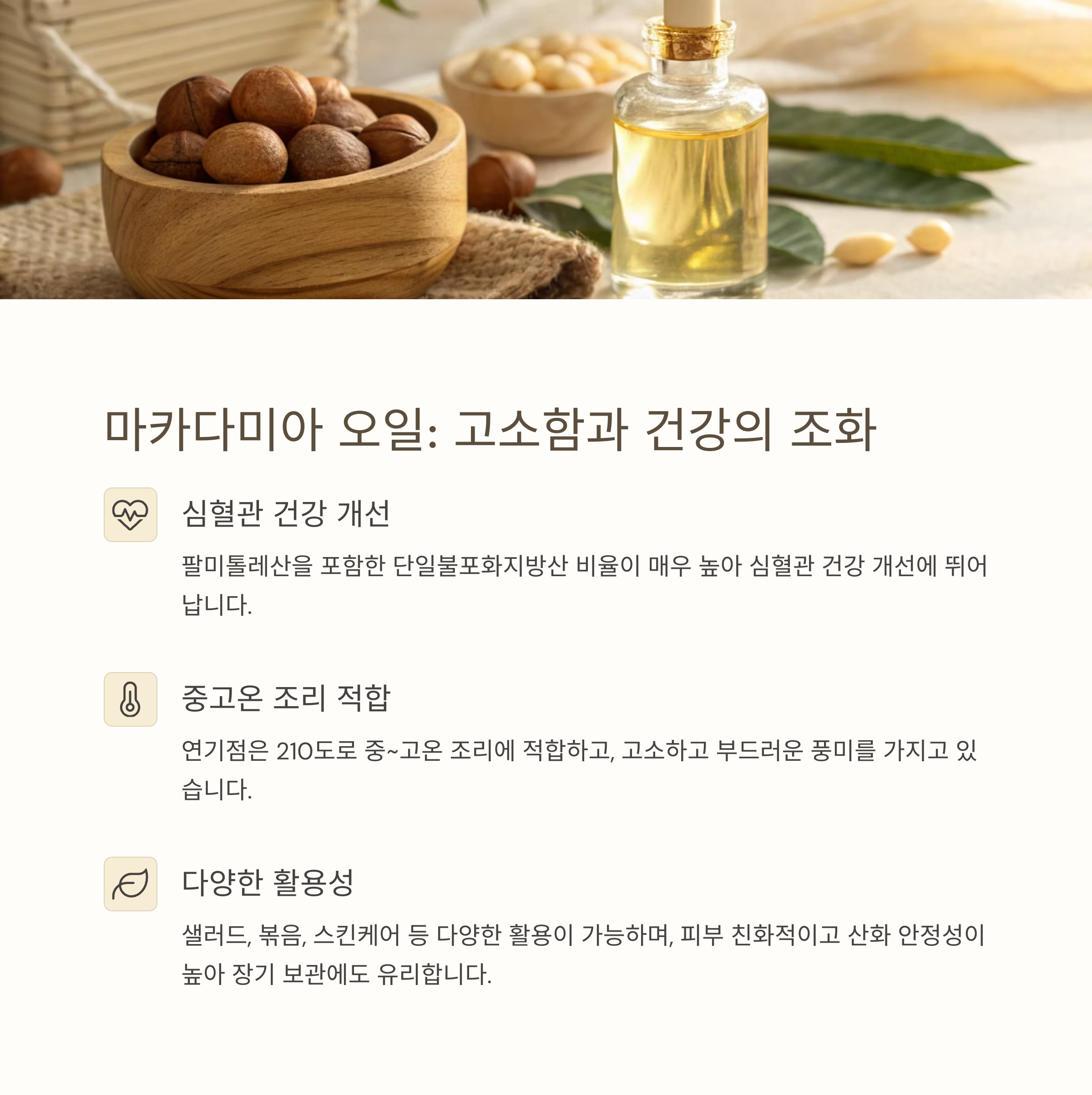 | 심혈관 건강 관리 | 마카다미아 오일, 올리브 오일 |