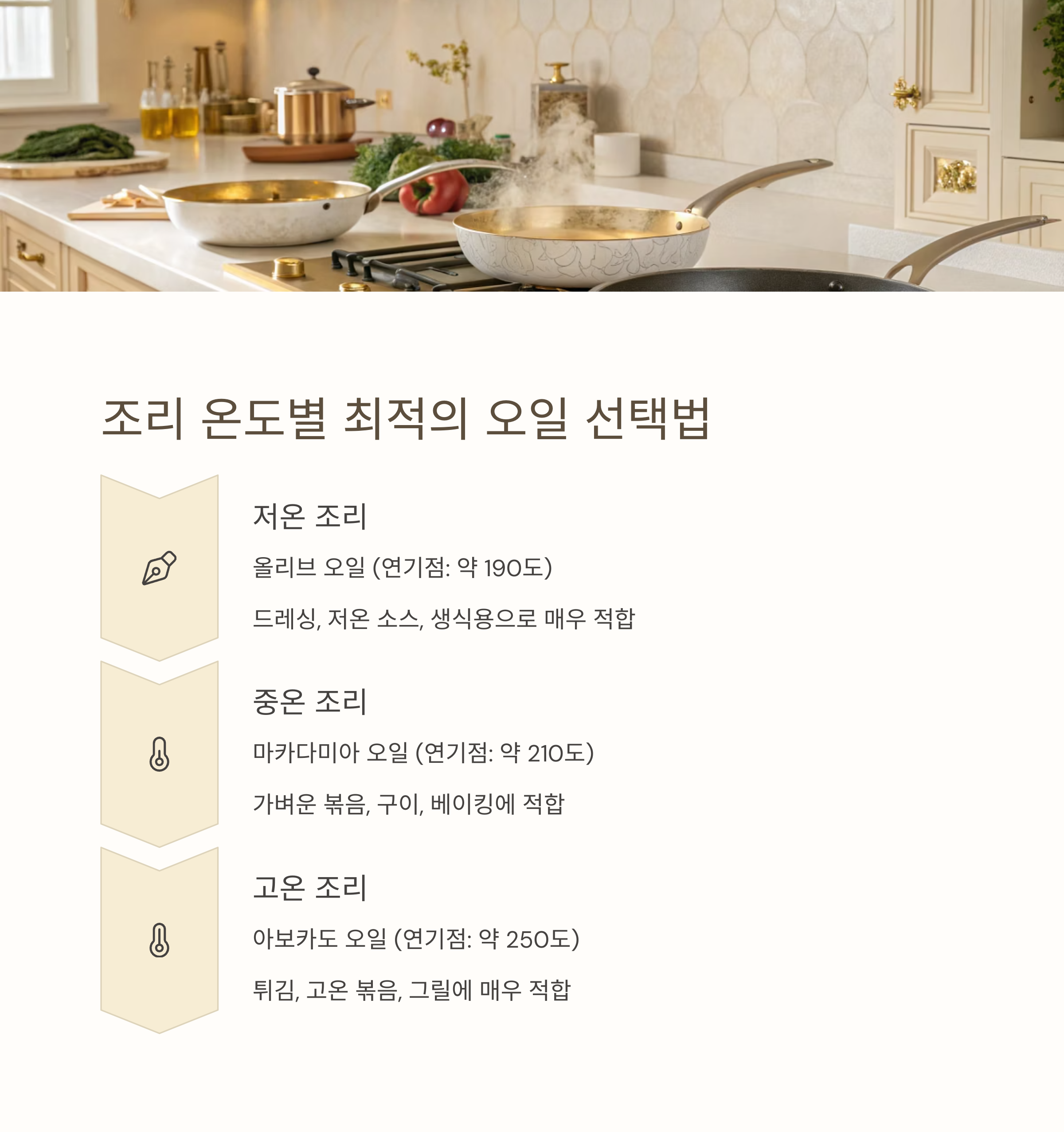 | 고온 조리 적합성 | 낮음 | 매우 높음 | 중간 이상 |