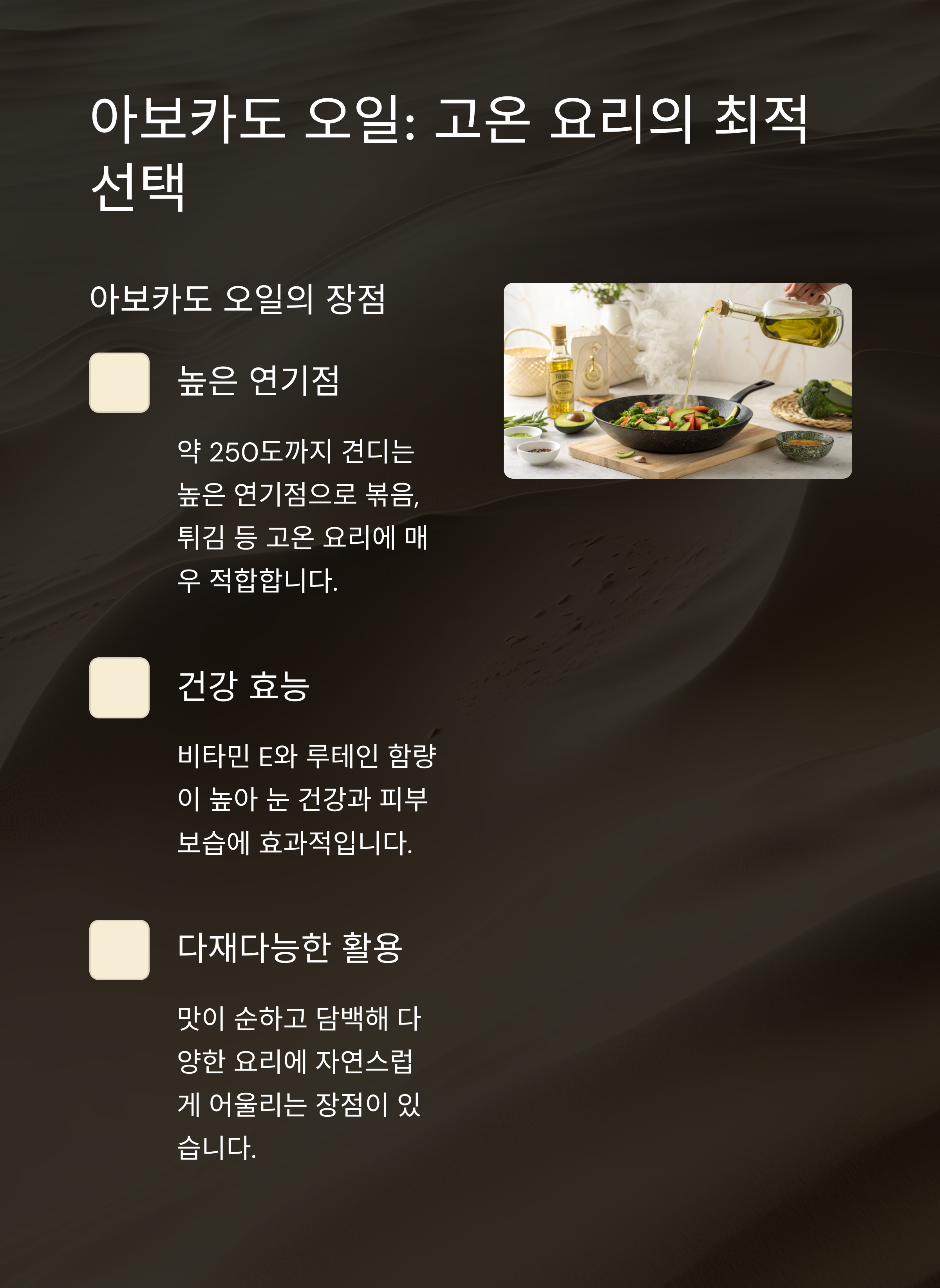 아보카도 오일은 약 250도까지 견디는 높은 연기점을 지녀