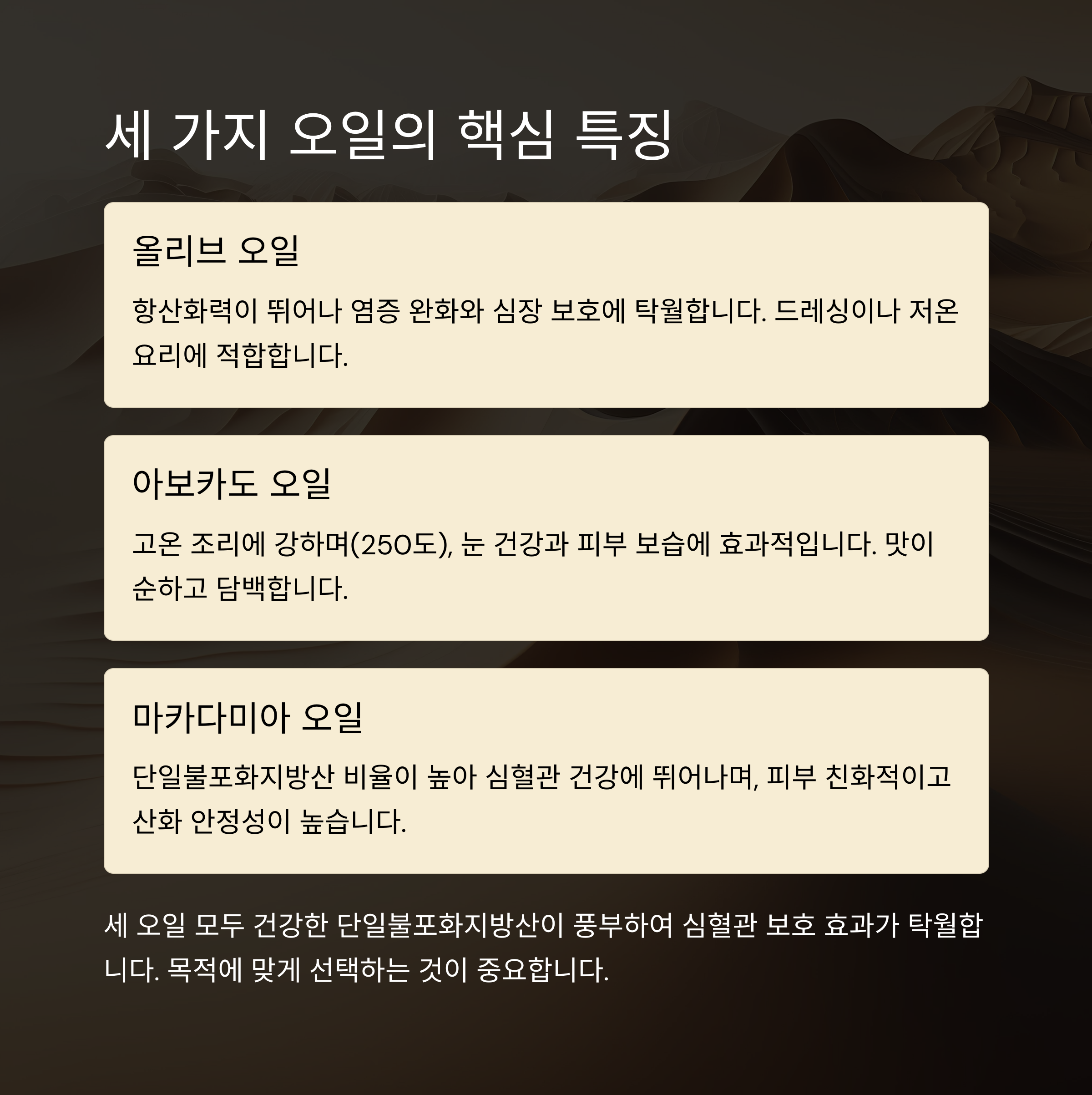 올리브 오일은 항산화력이 뛰어나고, 아보카도 오일은 고온 조리에 강하며, 마카다미아 오일은 심장과 피부 건강을 동시에 챙길 수 있는 만능 오일입니다. 세 가지 모두 건강한 단일불포화지방산이 풍부하여 심혈관 보호 효과가 탁월하며, 각 오일의 장단점을 이해하고 목적에 따라 선택하는 것이 중요합니다.