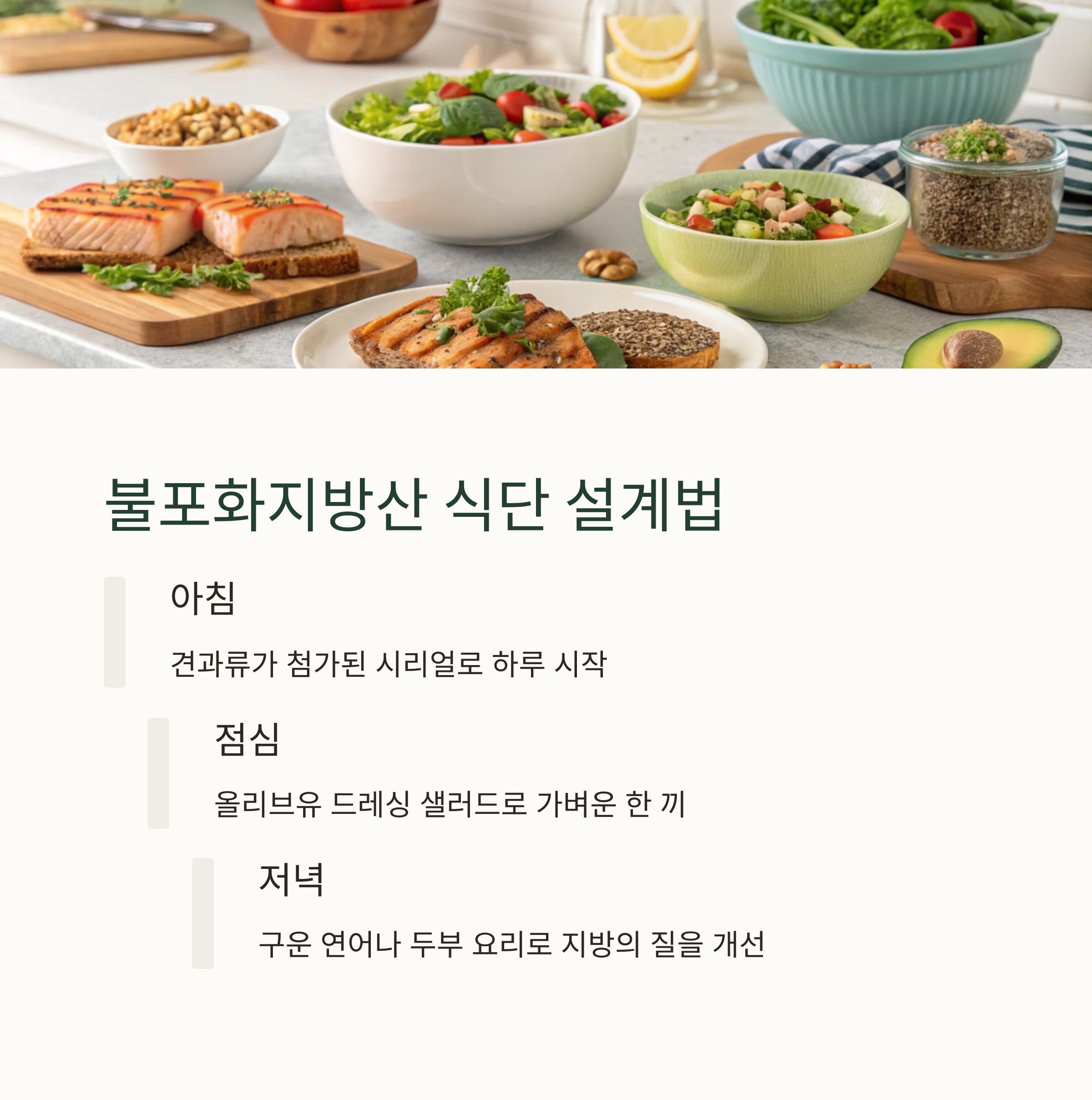 하루 식단 중 한 끼 이상에 불포화지방산 식품을 포함시키는 것이 이상적입니다
