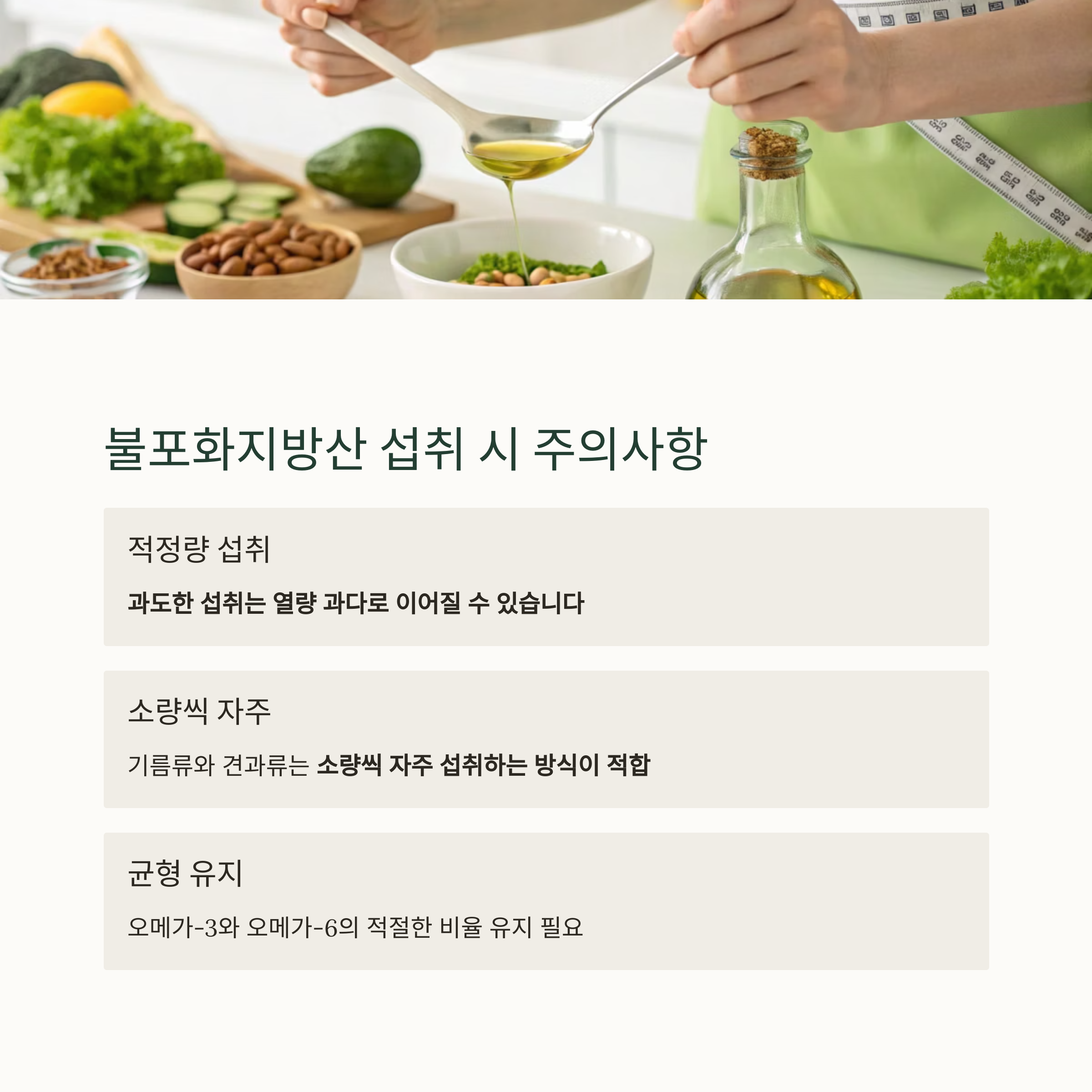 | 올리브유 | 단일불포화 (오메가-9) | 염증 완화, 심장 질환 예방 |