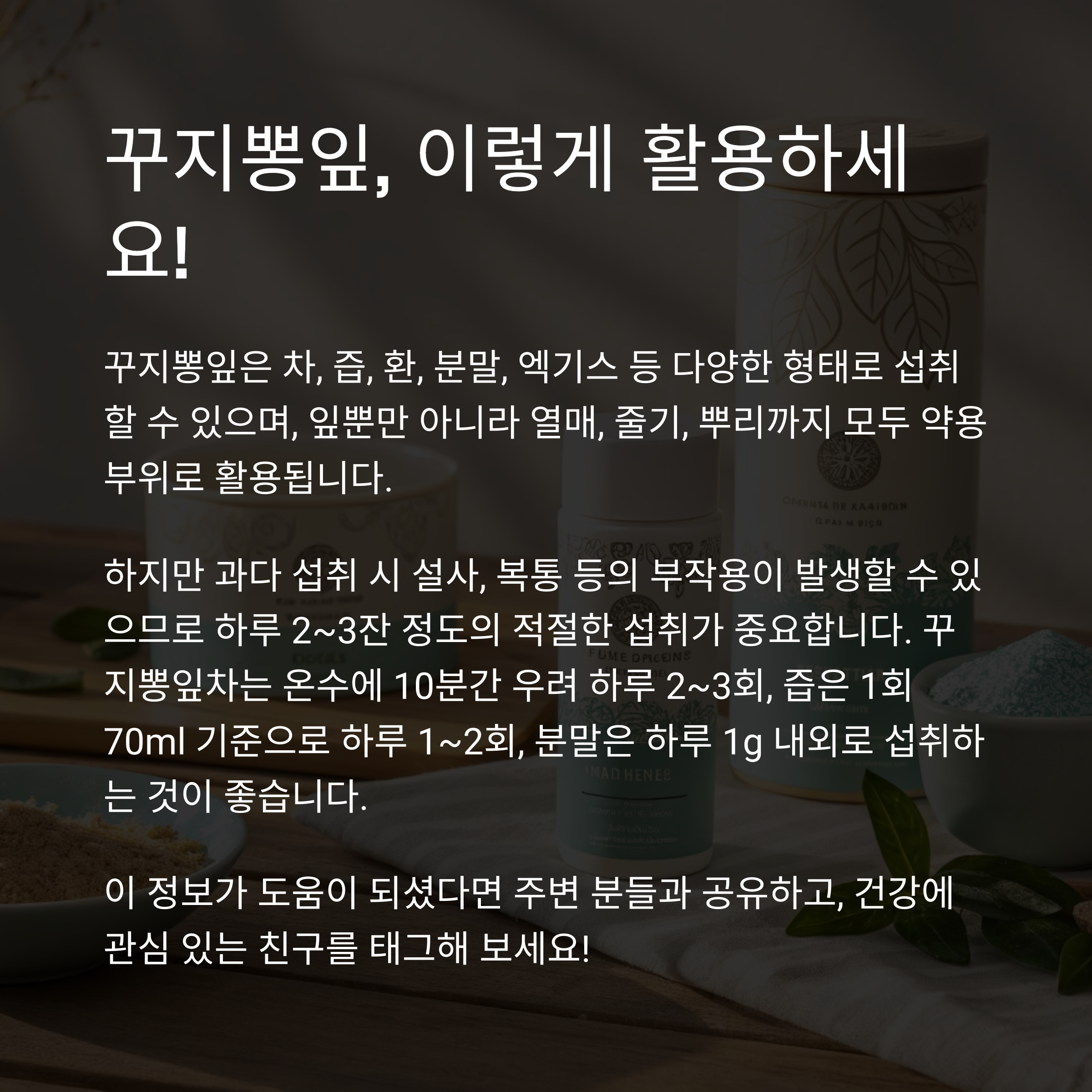 | 꾸지뽕잎차 | 온수에 10분 우려내기 | 하루 2~3회 |