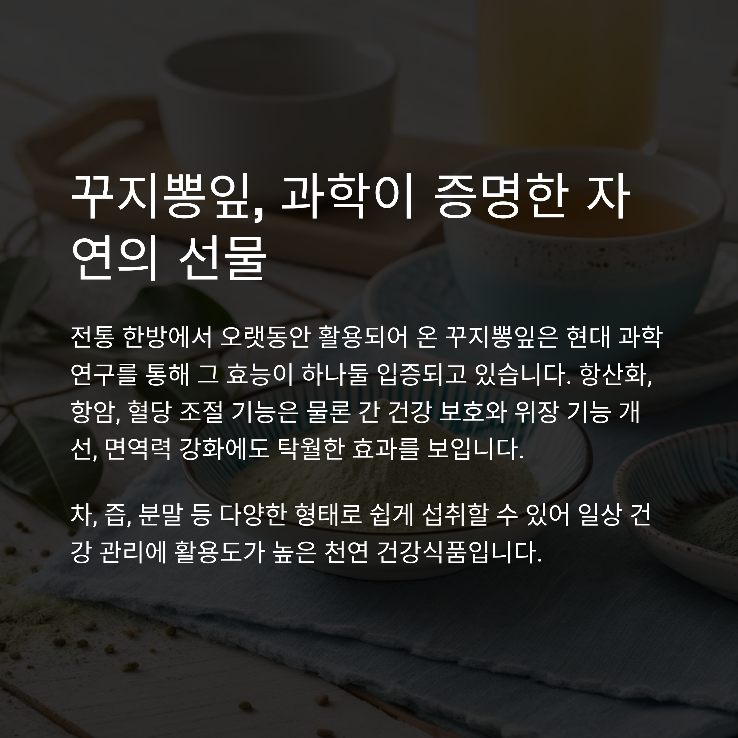 꾸지뽕잎은 전통 한방에서 활용되던 약초 중 하나로, 과학적 연구를 통해 다양한 효능이 입증되고 있습니다. 항산화, 항암, 혈당 조절 등의 기능뿐 아니라 간 건강 및 위장 보호, 면역력 강화에도 탁월한 효과를 보이며 차, 즙, 분말 형태로 쉽게 섭취할 수 있어 활용도가 높습니다.