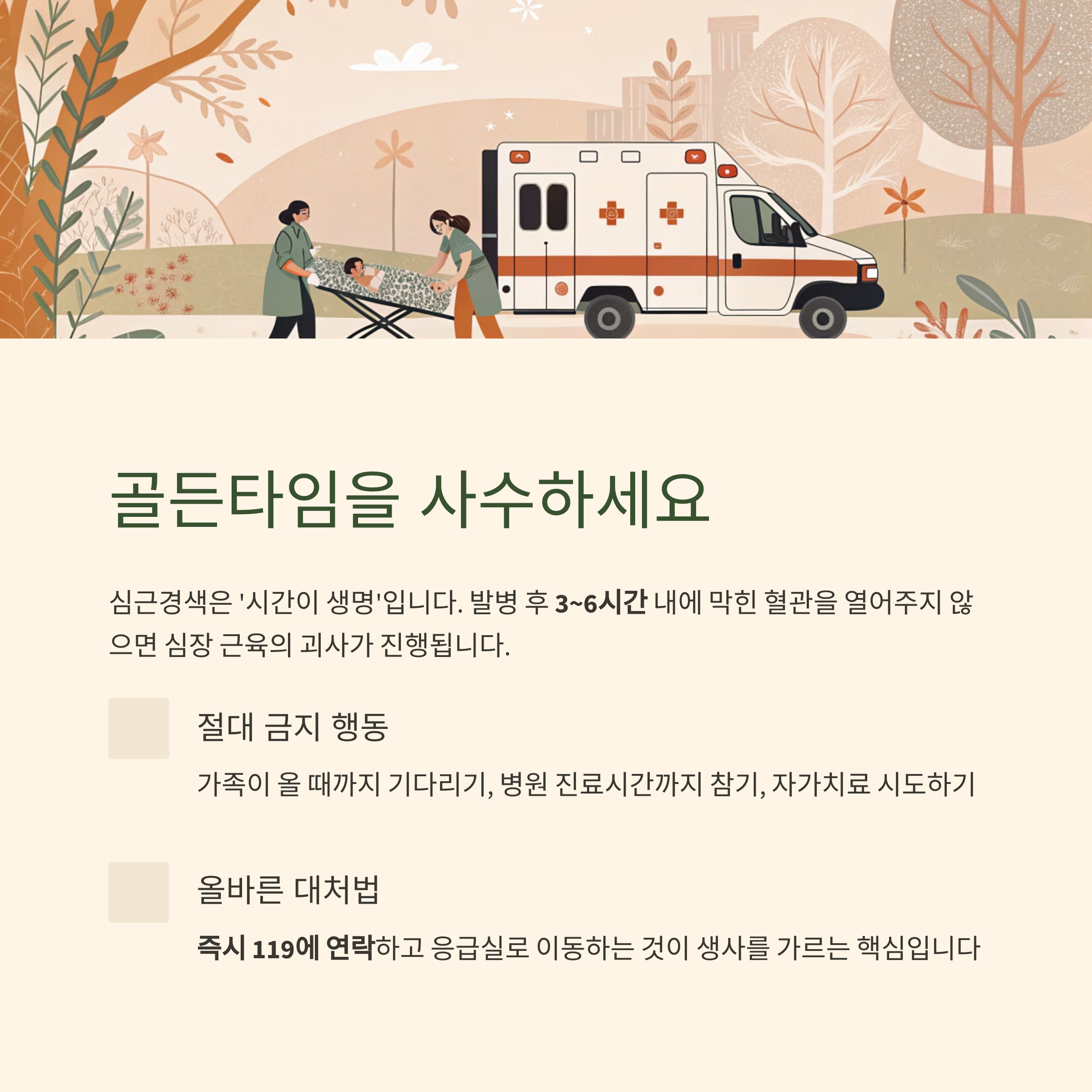 가장 빠르게 119를 부르고 응급실로 이동하는 것이 생사를 가르는 핵심입니다.