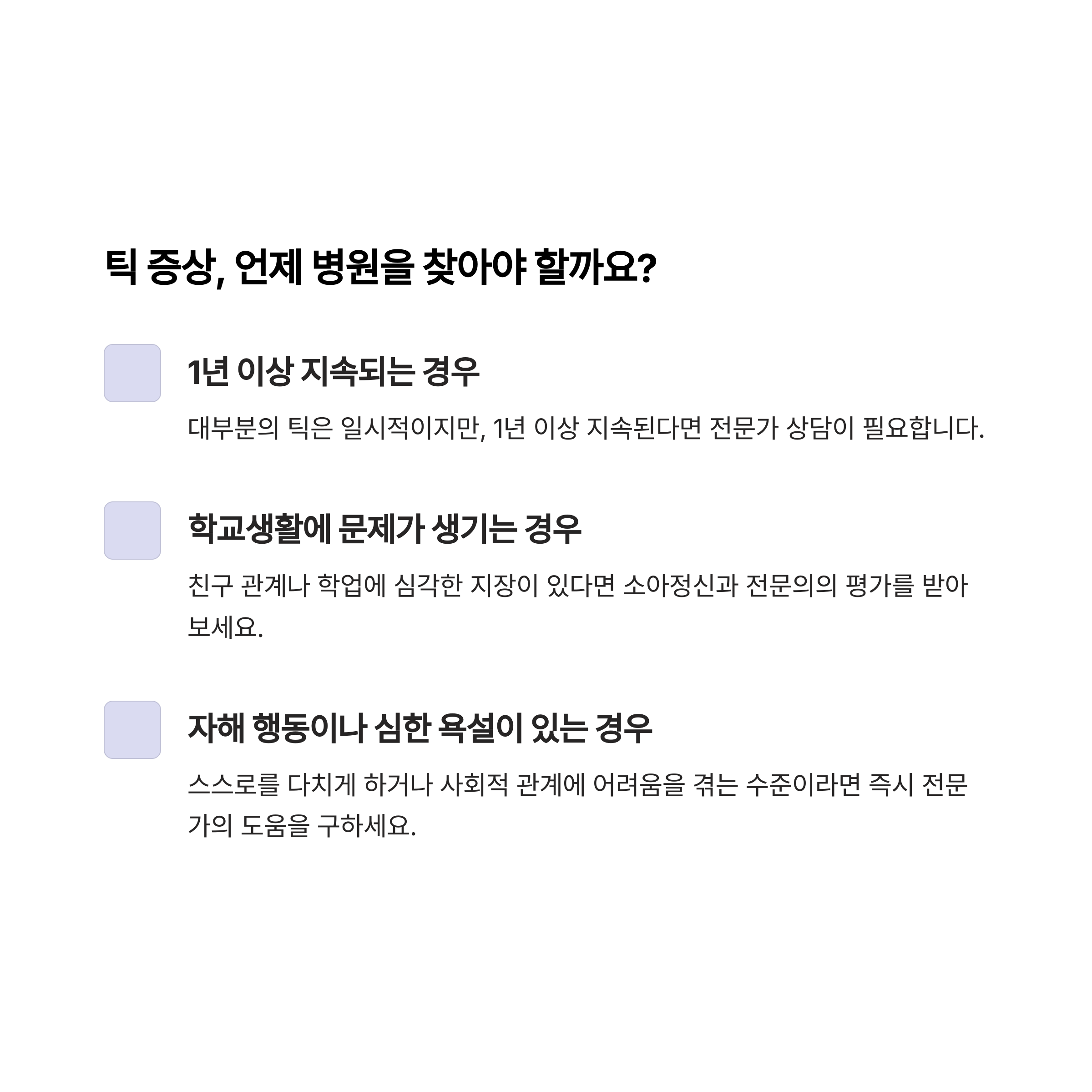 행동까지 이어져 고민이 깊어지곤 합니다. 이번 글에서는 틱 증상의 종류부터 대처 방법,