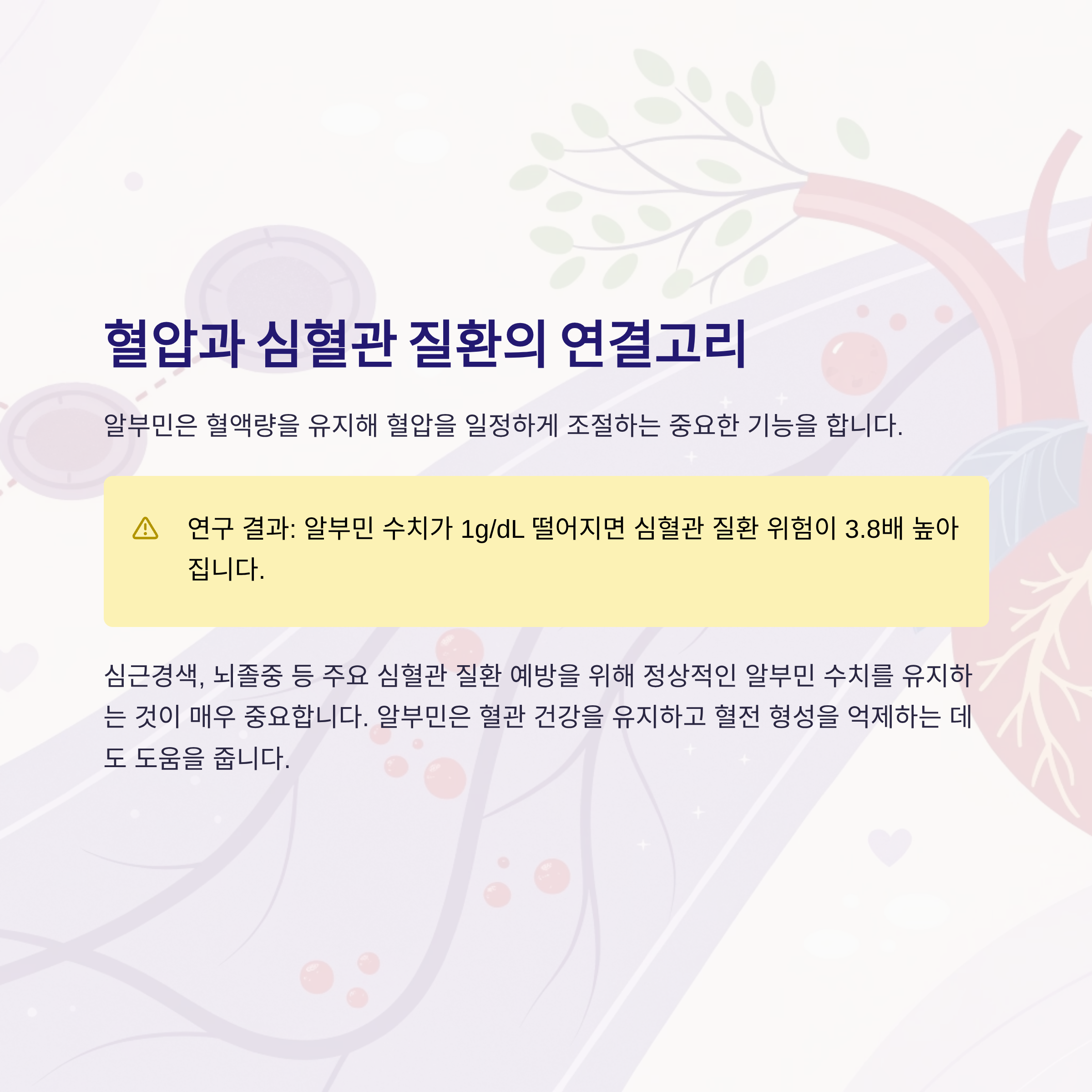 알부민은 혈액량을 유지해 혈압을 일정하게 조절하는 기능이 있습니다.