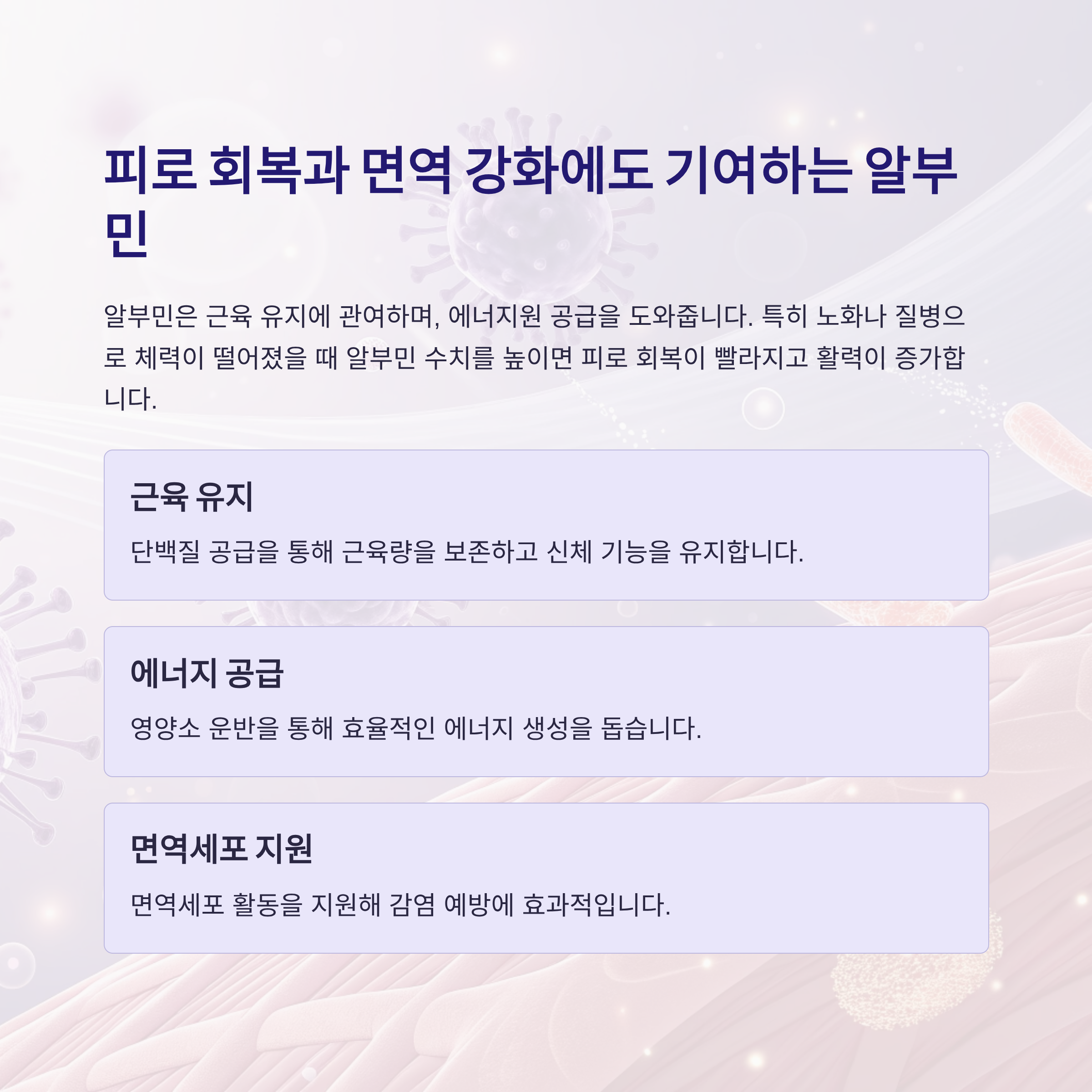 알부민은 근육 유지에 관여하며, 에너지원 공급을 도와줍니다.