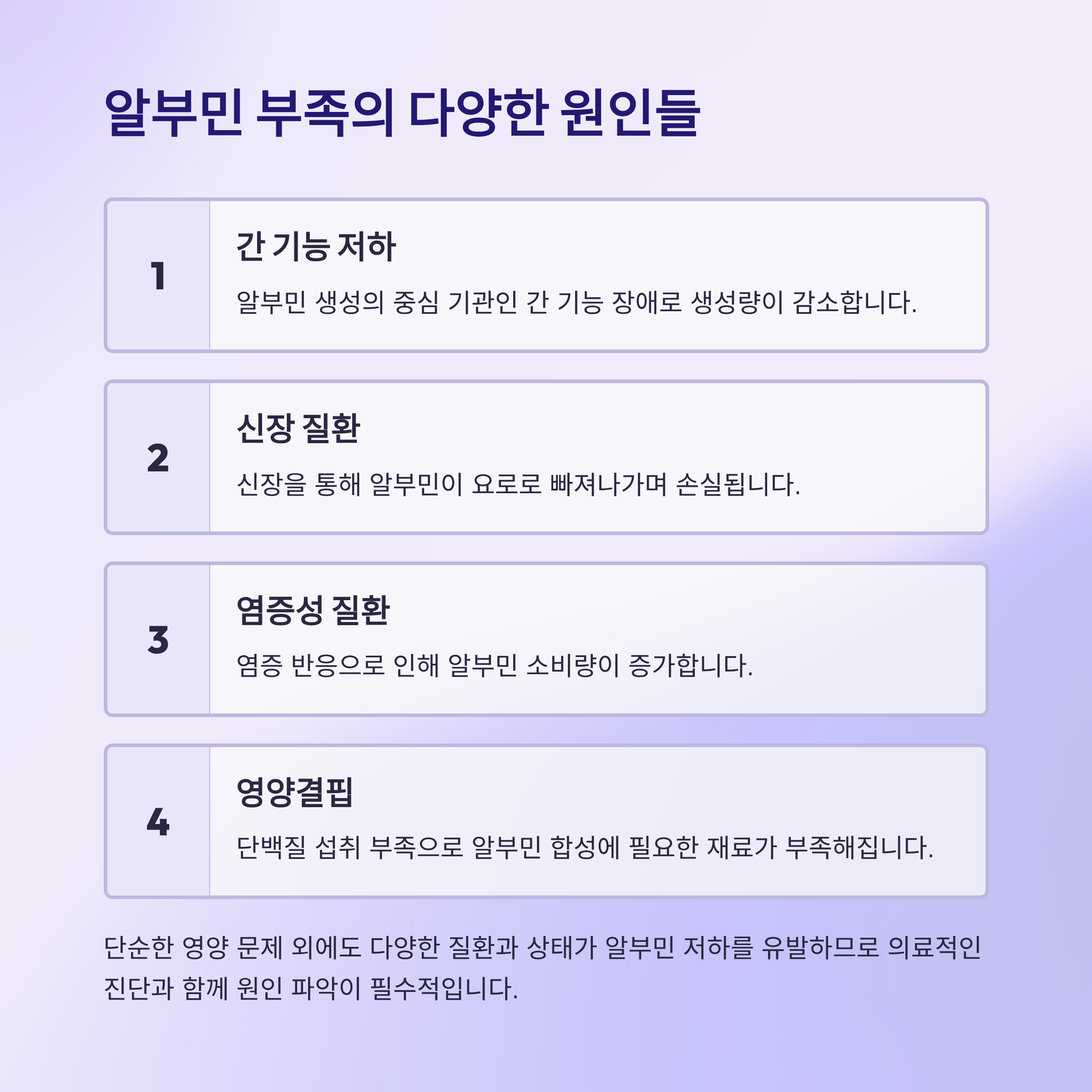 단순한 영양 문제 외에도 다양한 질환과 상태가 알부민 저하를 유발하므로