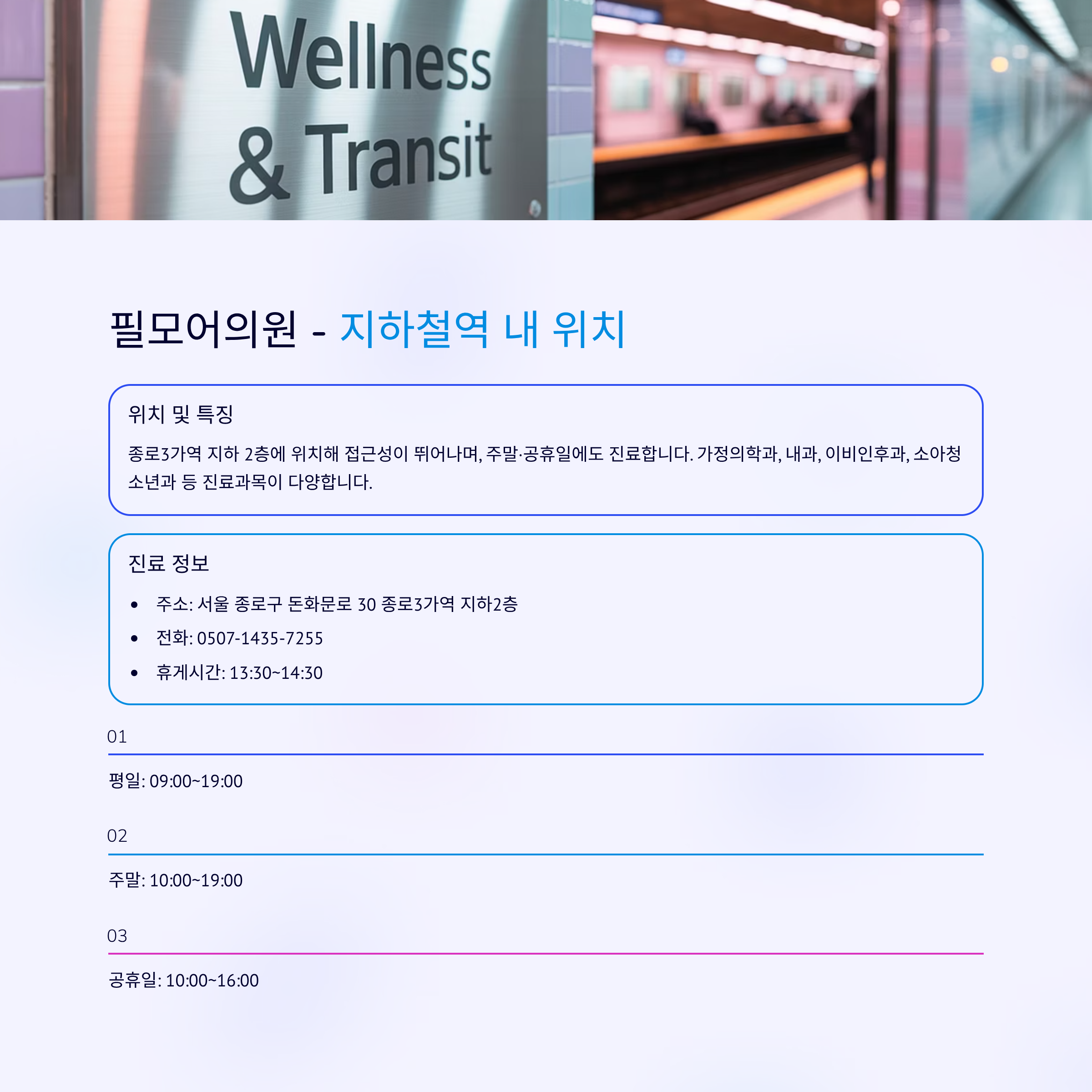 종로3가역 지하 2층에 위치해 접근성이 뛰어난 필모어의원은 주말·공휴일에도 진료합니다. 가정의학과, 내과, 이비인후과, 소아청소년과 등 진료과목이 다양하며, 휴게시간은 13:30~14:30입니다.