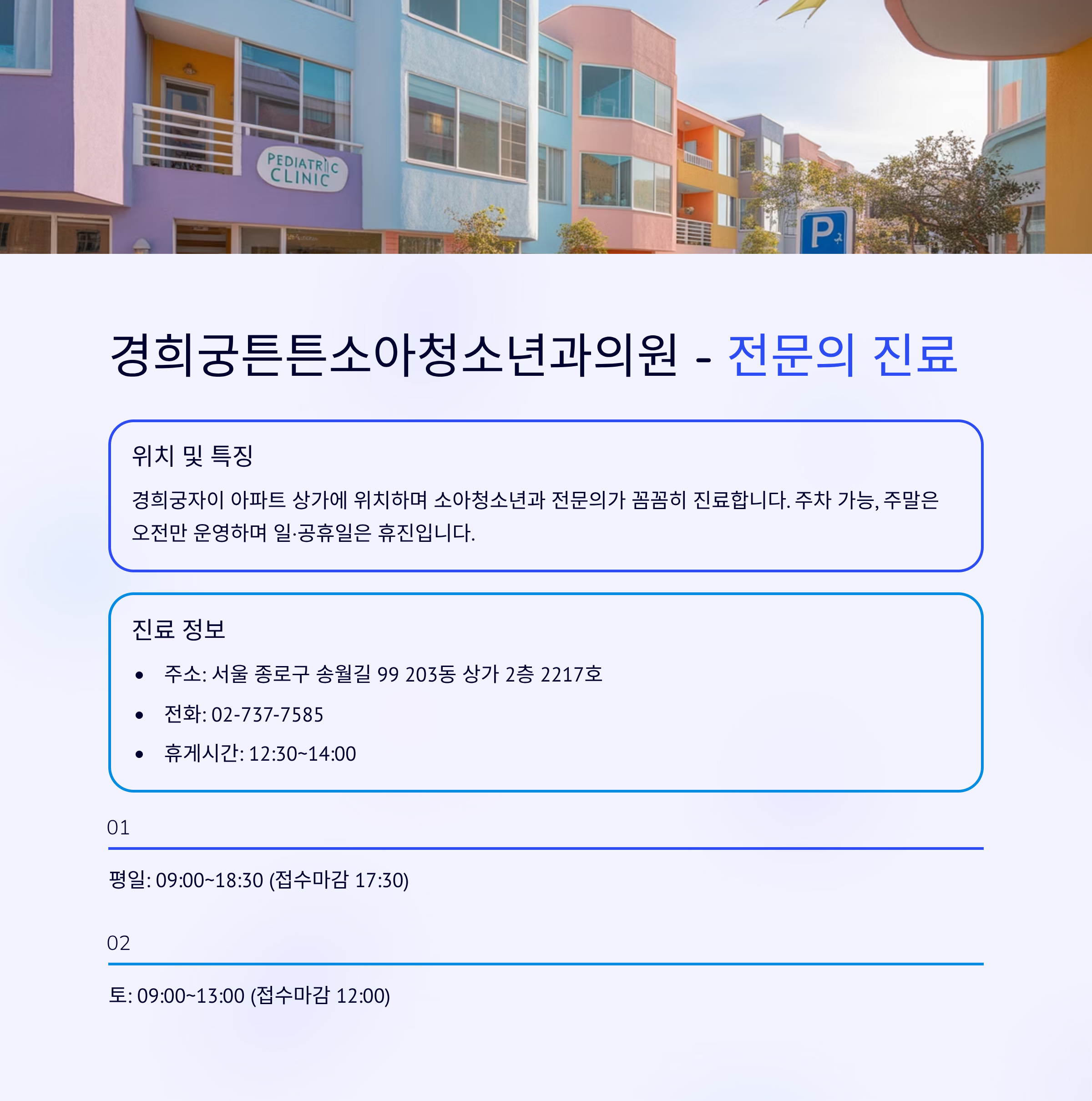 경희궁자이 아파트 상가에 위치한 경희궁튼튼소아청소년과는 소아청소년과 전문의가 꼼꼼히 진료하며, 주차가 가능해 편리합니다. 일·공휴일 휴진이며, 토요일은 오전 진료만 운영합니다.