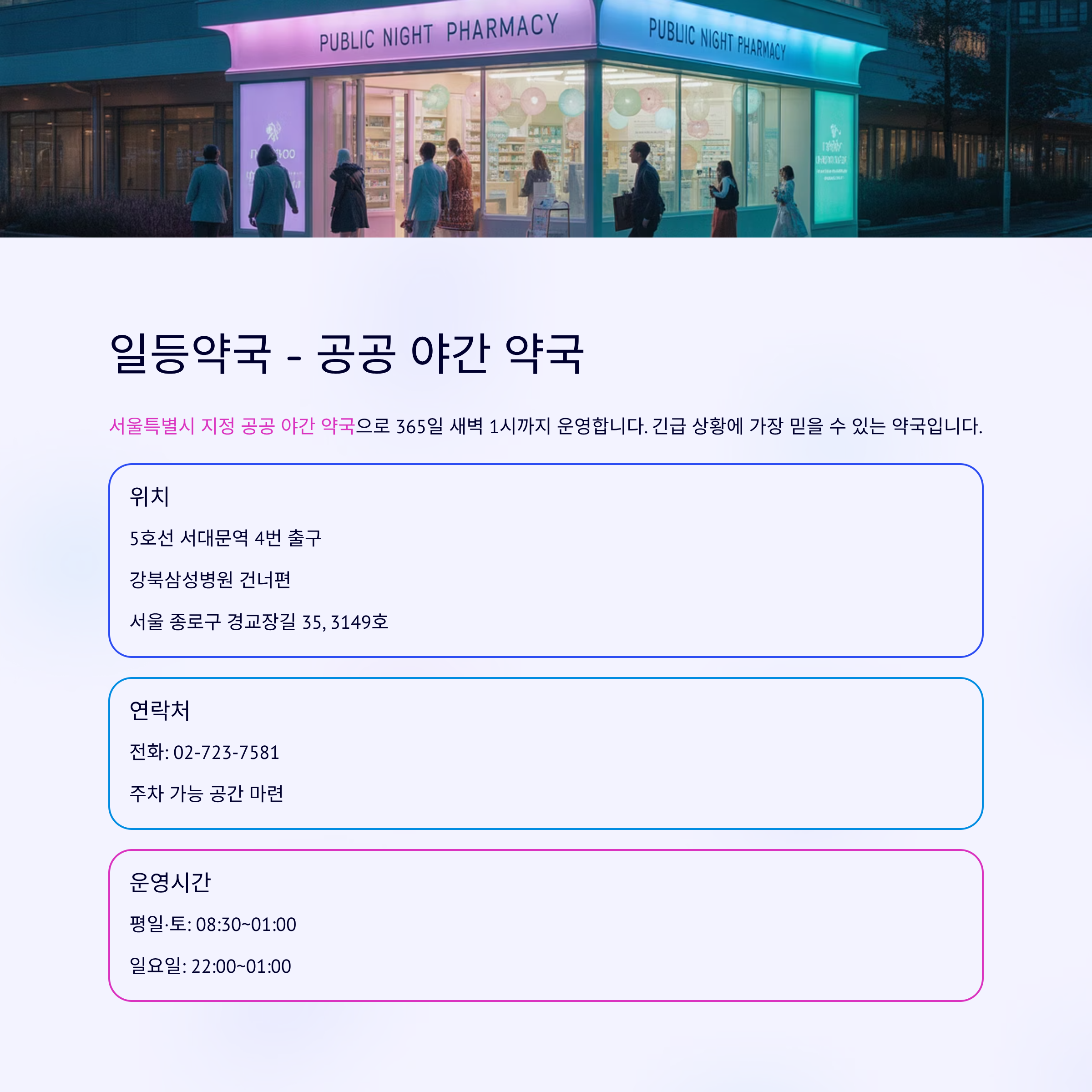 5호선 서대문역 4번 출구, 강북삼성병원 건너편에 위치한 서울특별시 지정 공공 야간 약국입니다. 365일 새벽 1시까지 운영하며, 주차 가능 공간도 마련되어 있습니다.