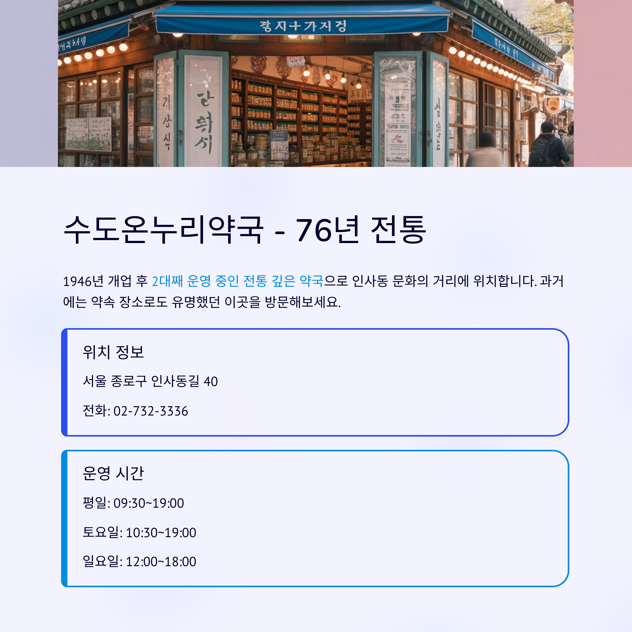 1946년 개업 후 2대째 운영 중인 전통 깊은 약국으로 인사동 문화의 거리에 위치합니다. 평일과 주말 모두 운영하나, 주말 운영시간이 다르니 사전 확인이 필요합니다. 과거에는 약속 장소로도 유명했습니다.