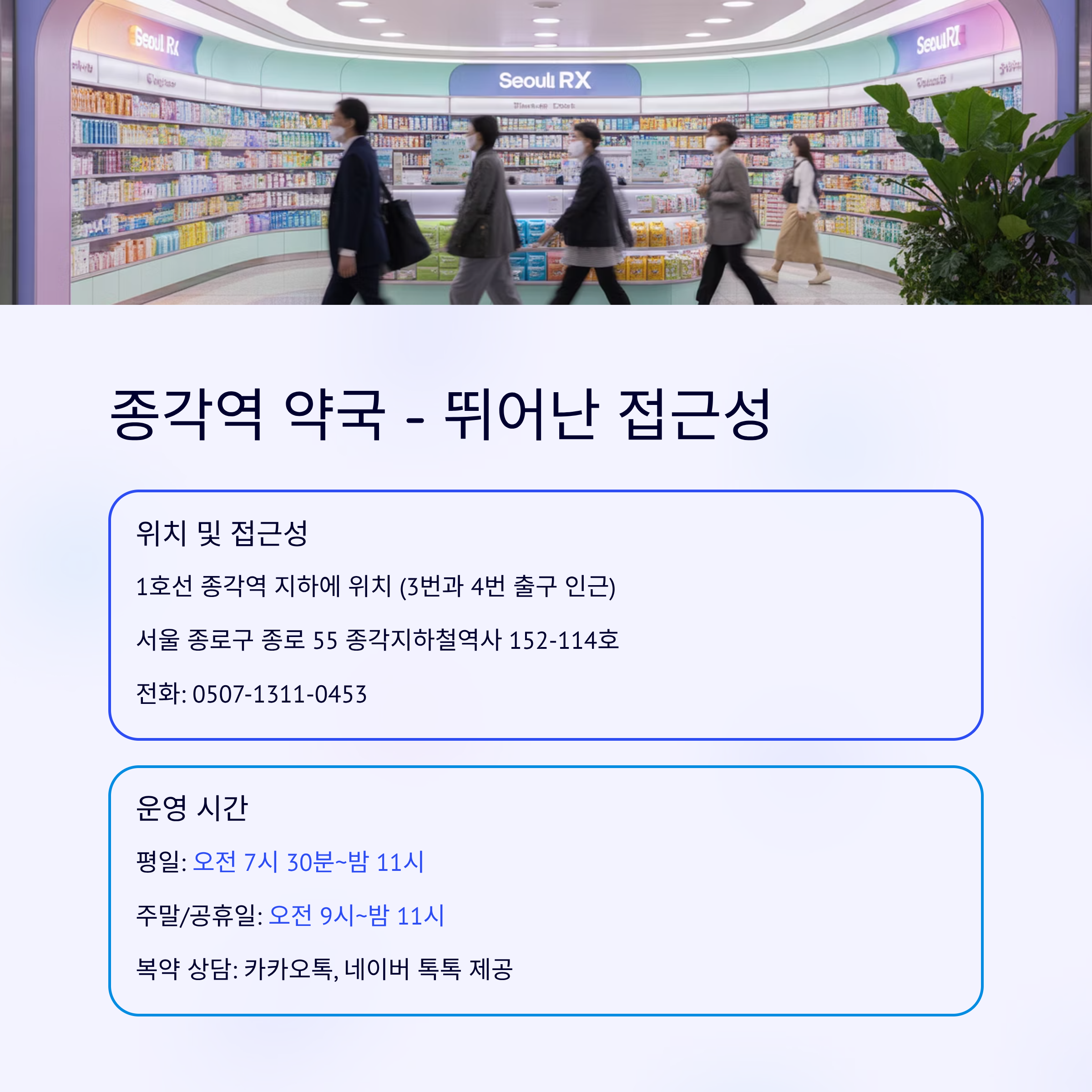1호선 종각역 지하에 위치하여 3번과 4번 출구 인근에서 쉽게 찾을 수 있습니다. 평일은 오전 7시 30분부터 밤 11시까지, 주말과 공휴일은 오전 9시부터 밤 11시까지 운영해 늦은 시간에도 방문이 가능합니다. 복약 상담은 카카오톡과 네이버 톡톡을 통해 제공됩니다.