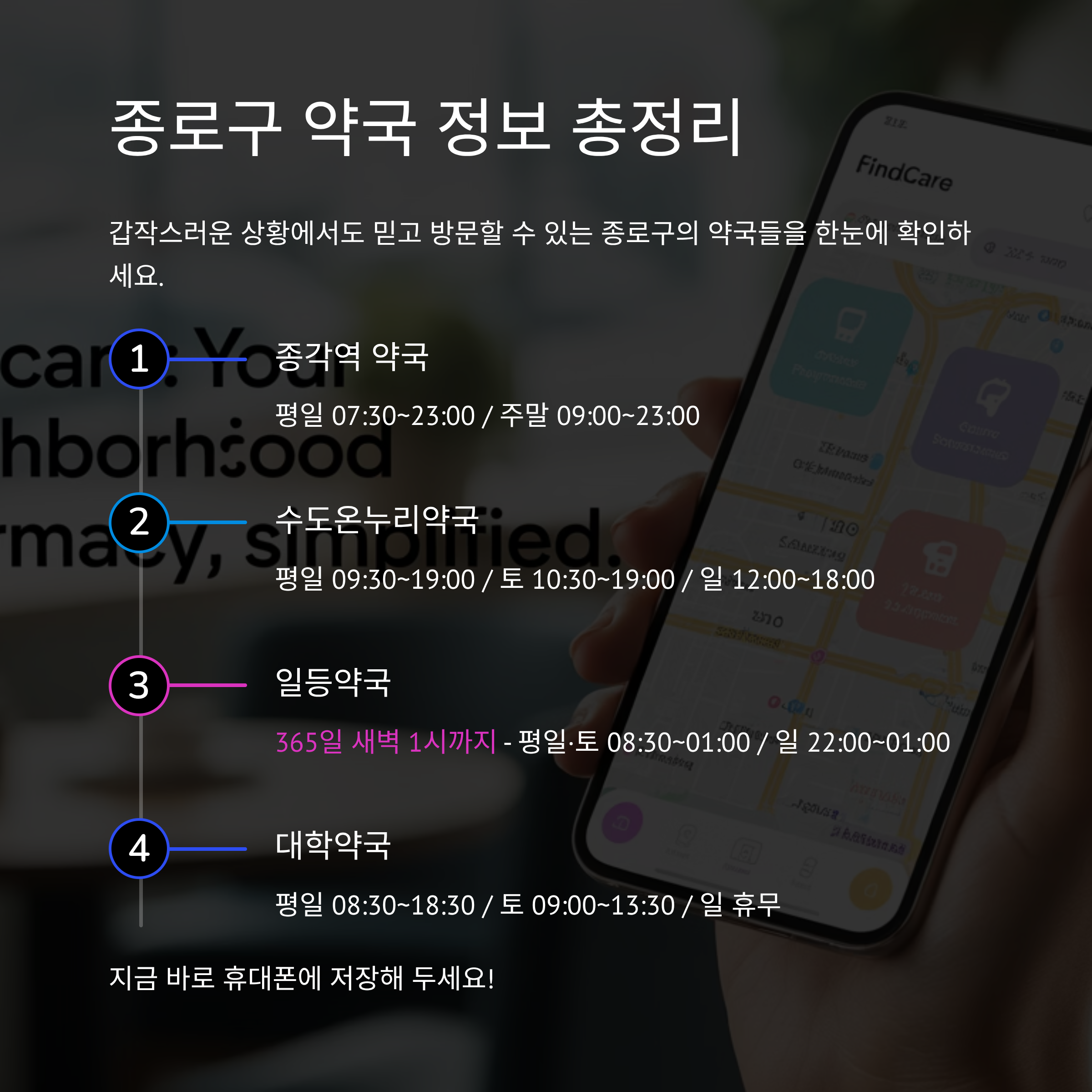 종로구에는 갑작스러운 상황에서도 믿고 방문할 수 있는 약국들이 있습니다. 종각역 약국, 수도온누리약국, 일등약국, 대학약국까지 각각의 운영 시간과 위치를 숙지해 두면, 필요할 때 빠르게 대응할 수 있습니다. 지금 바로 휴대폰에 저장해 두세요.